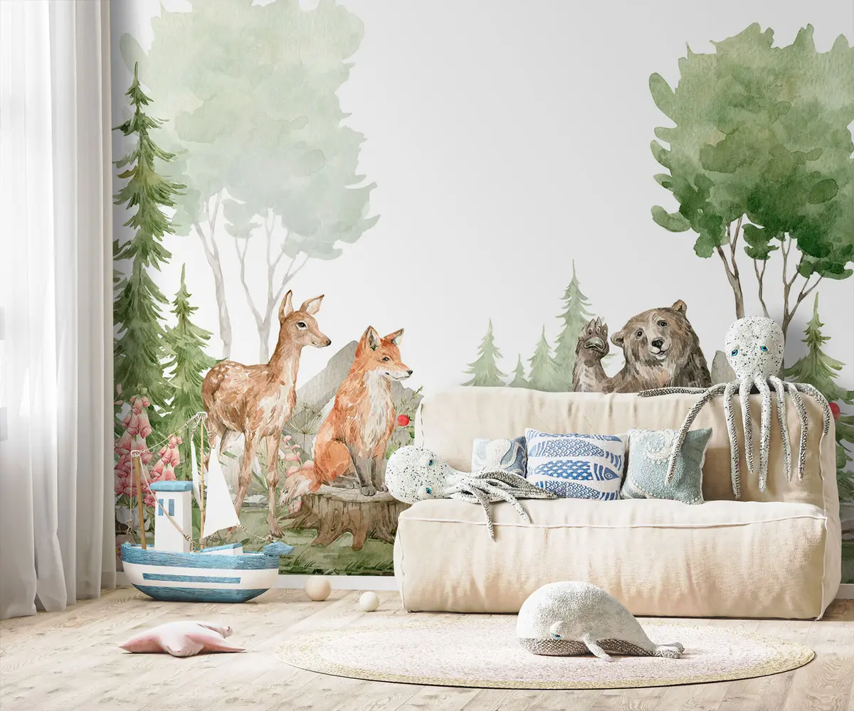 Fototapeten Aquarellzusammensetzung mit Waldtieren und Elementen der Natur N° u78735