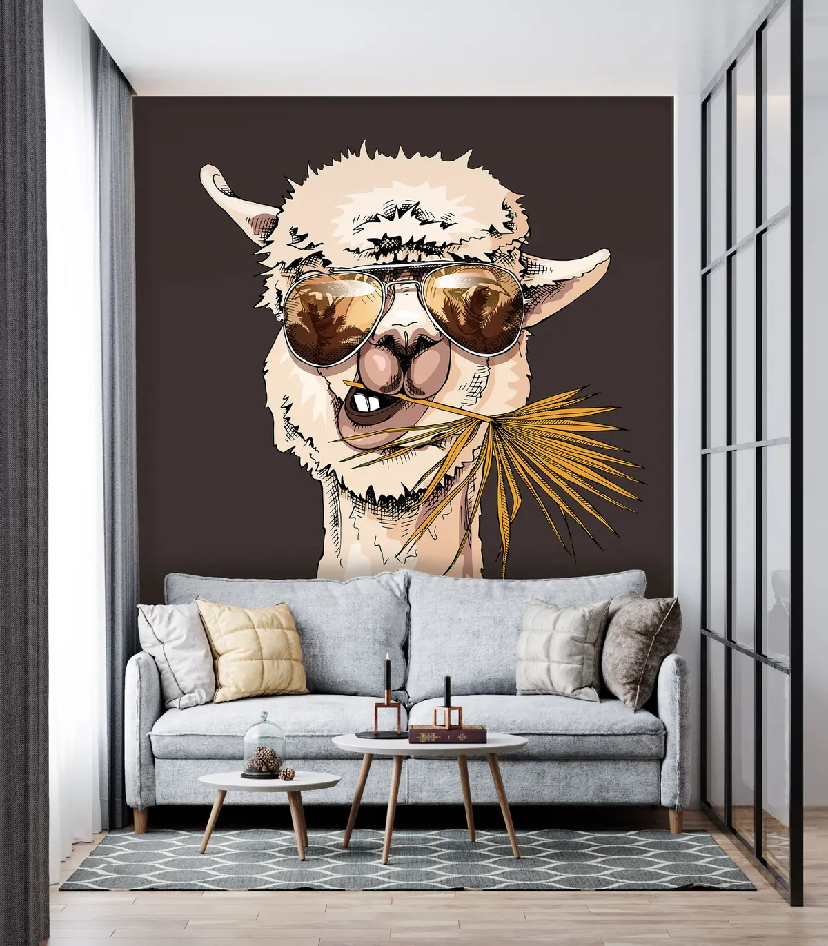 Fototapete Porträt eines Lamas mit Sonnenbrille und Fächerpalmenblatt u98177v2