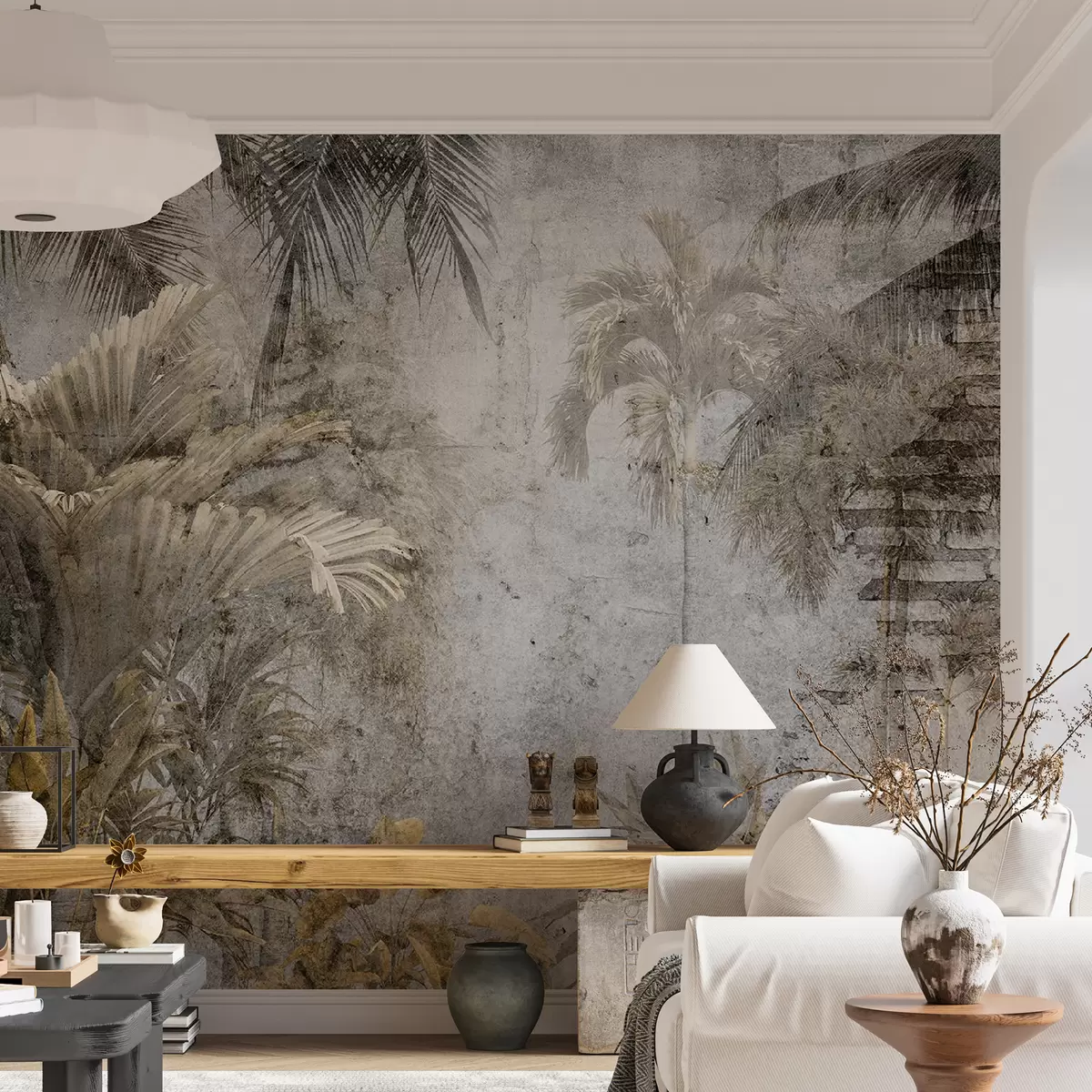 Fototapeten Tropischer Wald auf einer Betonwand N° u71248