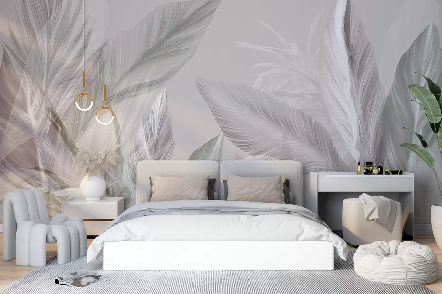 Fototapeten Weiche weiße, rosa und graue Federn und tropische Blätter schweben vor einem hellen Hintergrund