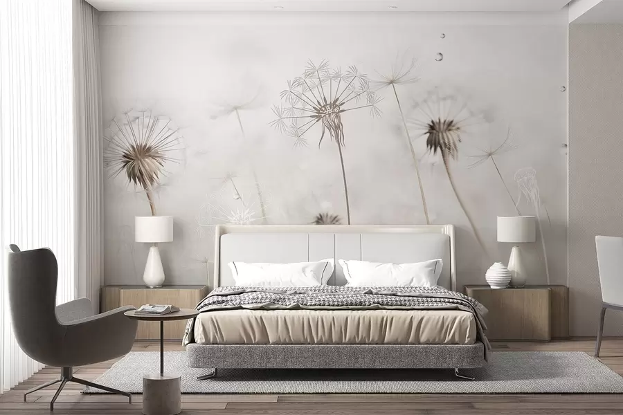 Fototapeten Anmutiges Muster mit zarten Pusteblumen, Pflanzen und Wildblumen in beige-grauen Tönen