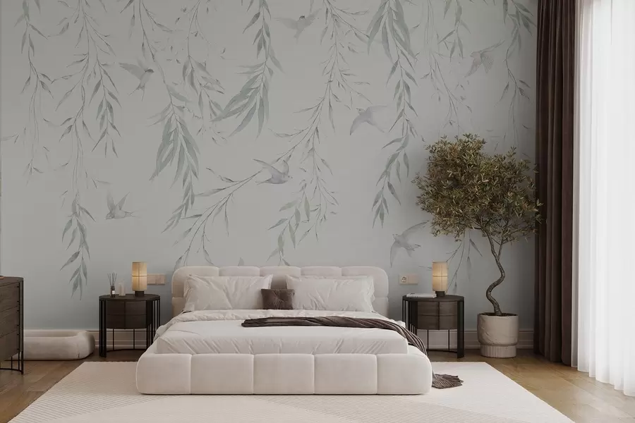 Fototapeten Zweige mit grünen Blättern hängen und Vögel