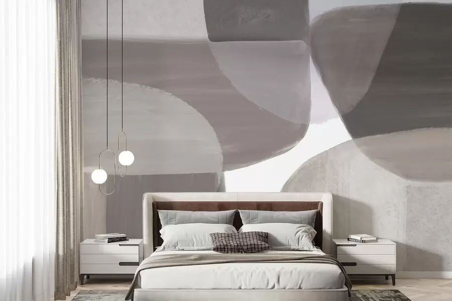 Fototapeten Ein monochromer abstrakter Druck mit sich überschneidenden minimalistischen Formen in Grau- und Beigetönen