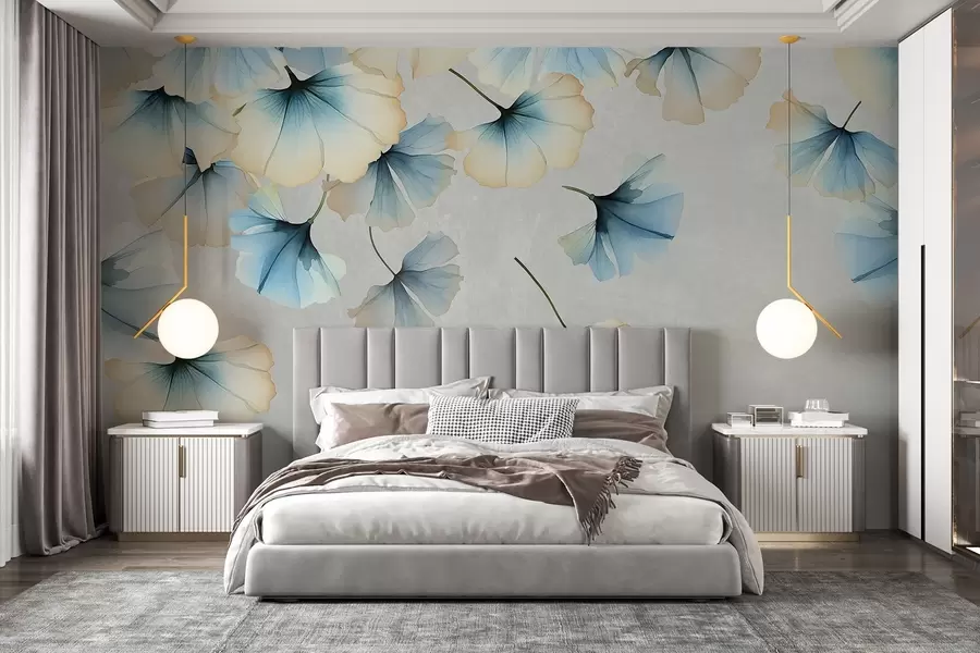 Fototapeten Pastellfarbene blaue und gelbe Ginkgoblätter mit zarten, in der Luft schwebenden Blütenblättern vor einem strukturierten Hintergrund