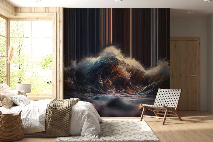 Fototapeten Große dunkle wütende Meereswelle in dunklen Farben mit hellen Akzenten auf einem gestreiften Hintergrund