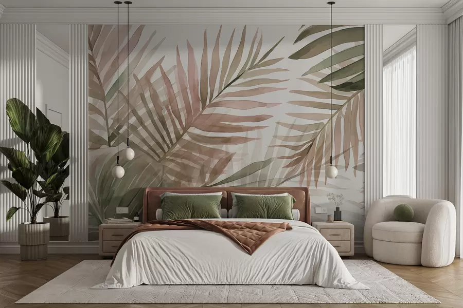 Fototapeten Palmenblätter in Aquarell in verschiedenen Grün- und Rosatönen vor hellem Hintergrund