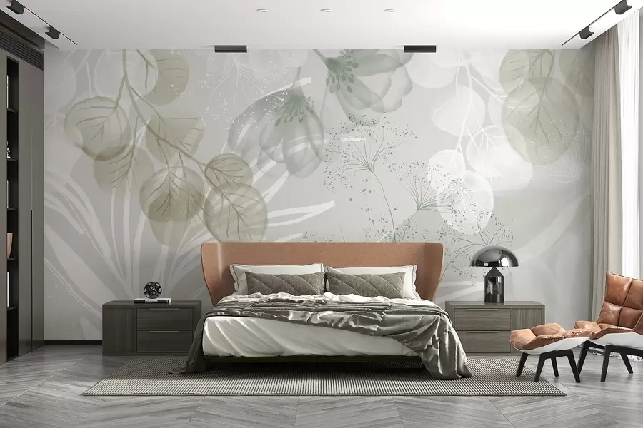 Fototapeten Florale Eukaliptus-Elemente in Grün- und Weißtönen mit sich überlappenden Blättern und Blütenblättern im minimalistischen Stil