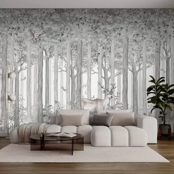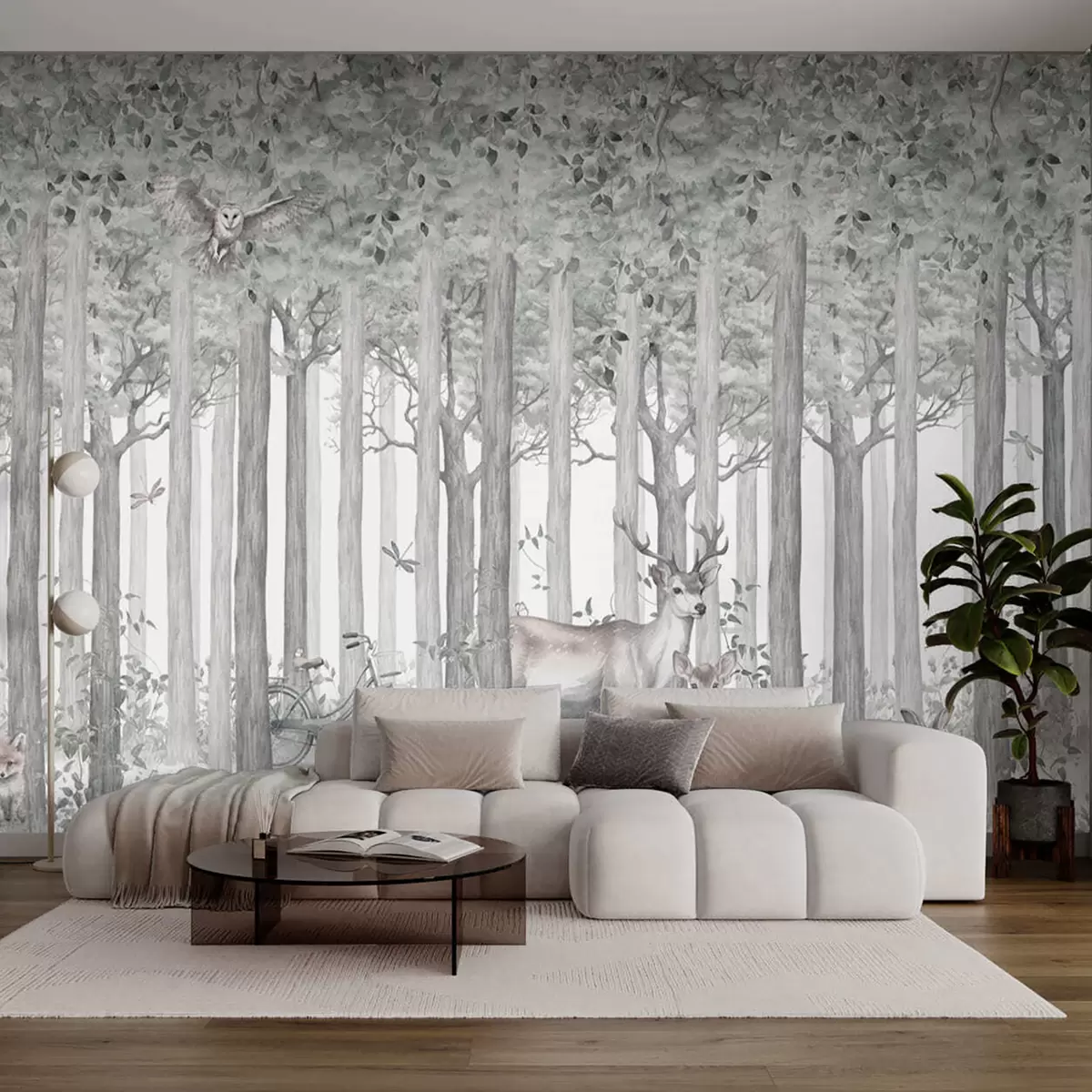Fototapeten Waldtiere Hirsch und Eule in Grau N° u97629v1