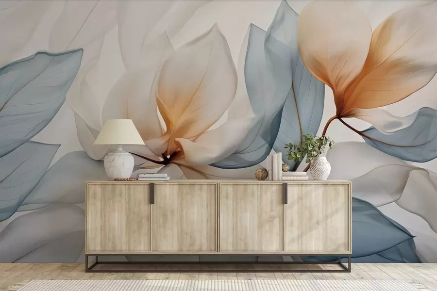 Fototapeten Weiche, pastellfarbene Blätter in Weiß-, Beige- und Hellblautönen, die eine zarte und ätherische Komposition ergeben