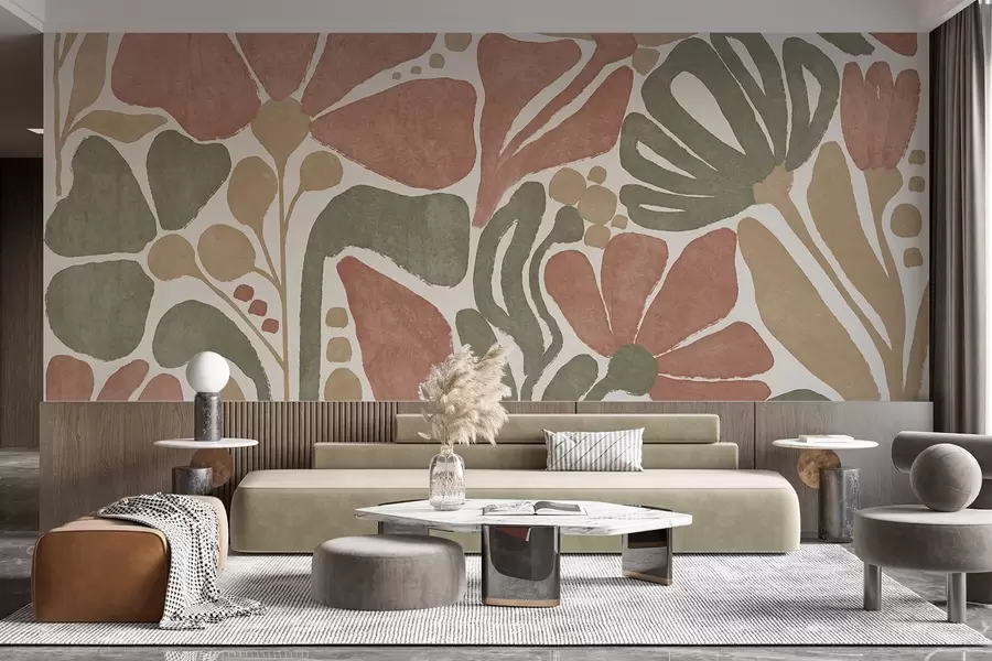 Fototapeten Abstrakte Blumen in Rot-, Grün- und Beigetönen, mit hellem Hintergrund, in einem flachen, stilisierten modernen minimalistischen Design