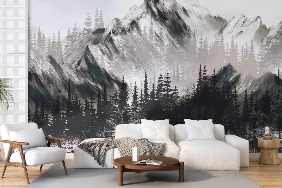 Fototapeten Alpine Berge im Schnee, Bleistiftstil, Minimalismus