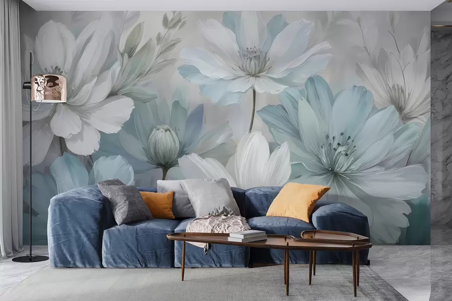 Fototapeten Ölgemälde Nachahmung eines Blumengartens mit weißen, blauen und orangefarbenen Blumen, weiche Pinselstriche, Pastell gedämpfte Farben