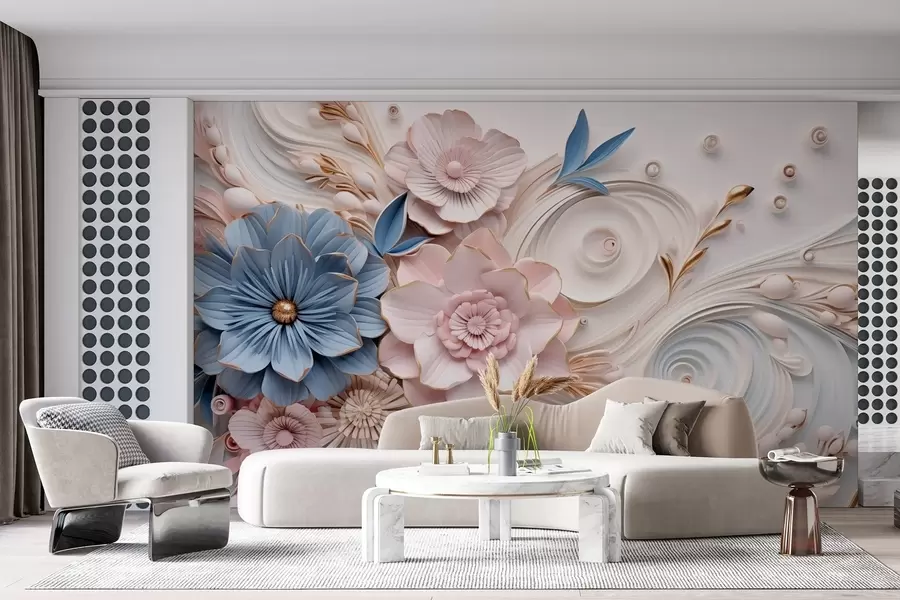 Fototapeten Eine zarte Blumenkomposition in Rosa- und Blautönen mit einem weichen Reliefhintergrund