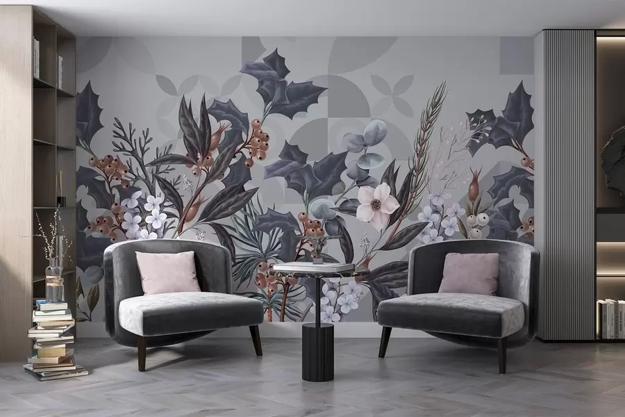 Fototapeten blätter und Blumen auf grauem Hintergrund