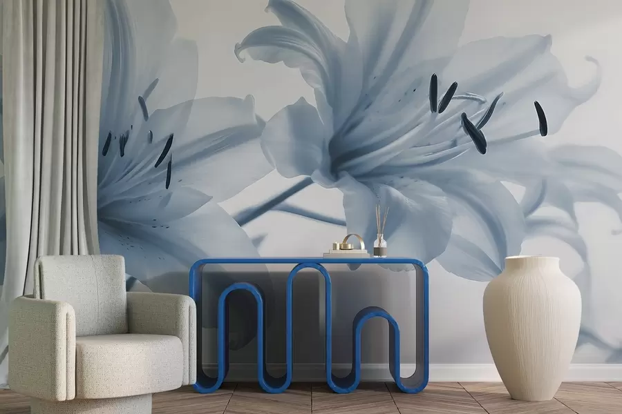 Fototapeten Weichzeichner-Nahaufnahme von blauen minimalistischen Lilienblüten vor einem hellen Hintergrund