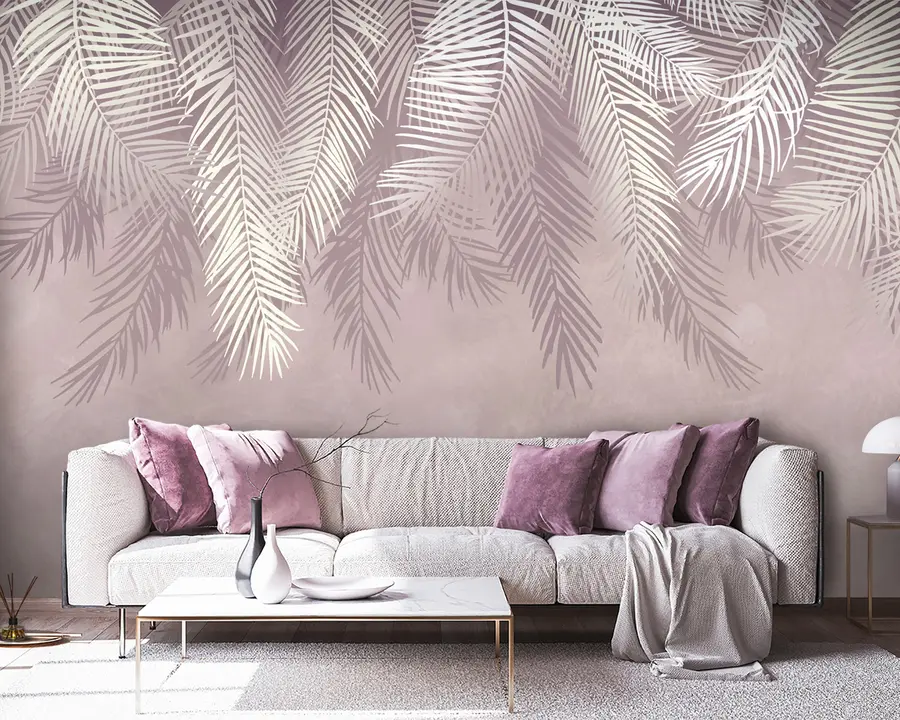 Fototapeten Grüne und rosa Palmenblätter in lila Farben