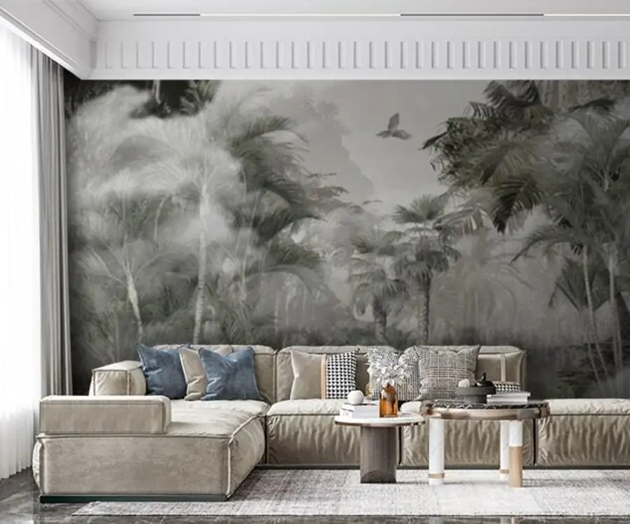 Fototapeten Orientalische Landschaft, Dschungel, Bäume, Aquarellstil, graue Farben