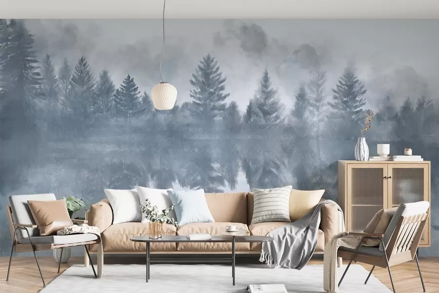 Fototapeten Mystischer Wald, Kiefern, Nebel, Acrylfarbe, tiefblaue Farben