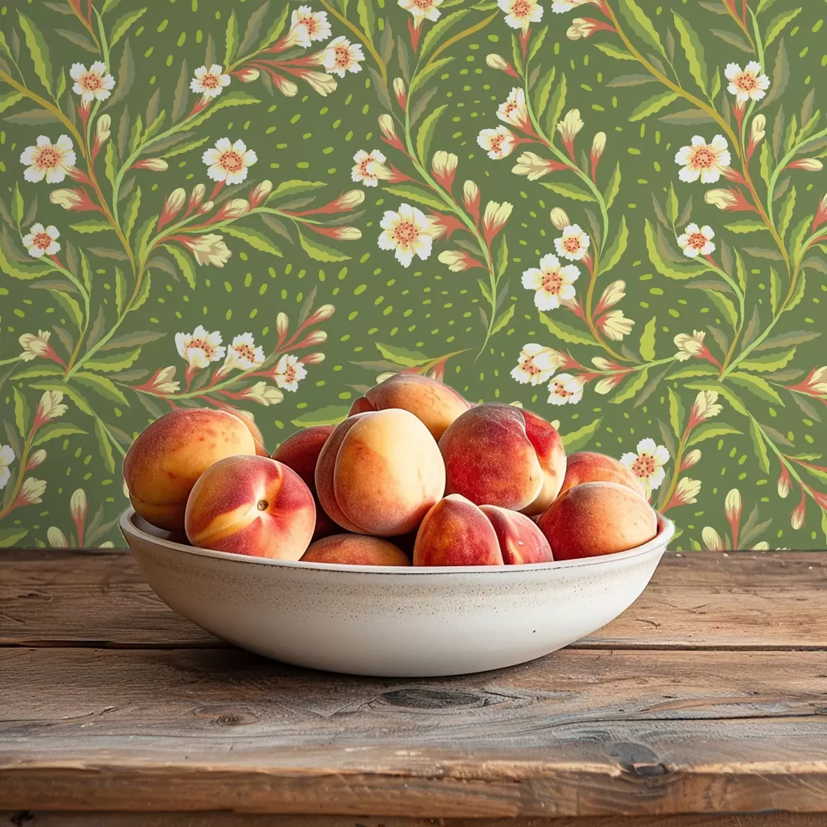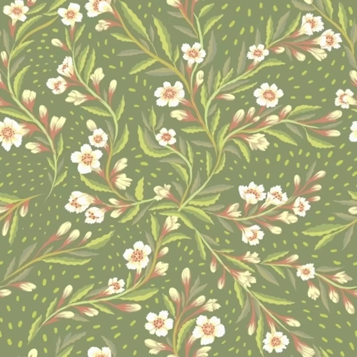 Fototapeten Weitläufige Zweige mit cremefarbenen Blüten auf olivfarbenem Hintergrund N° a00850