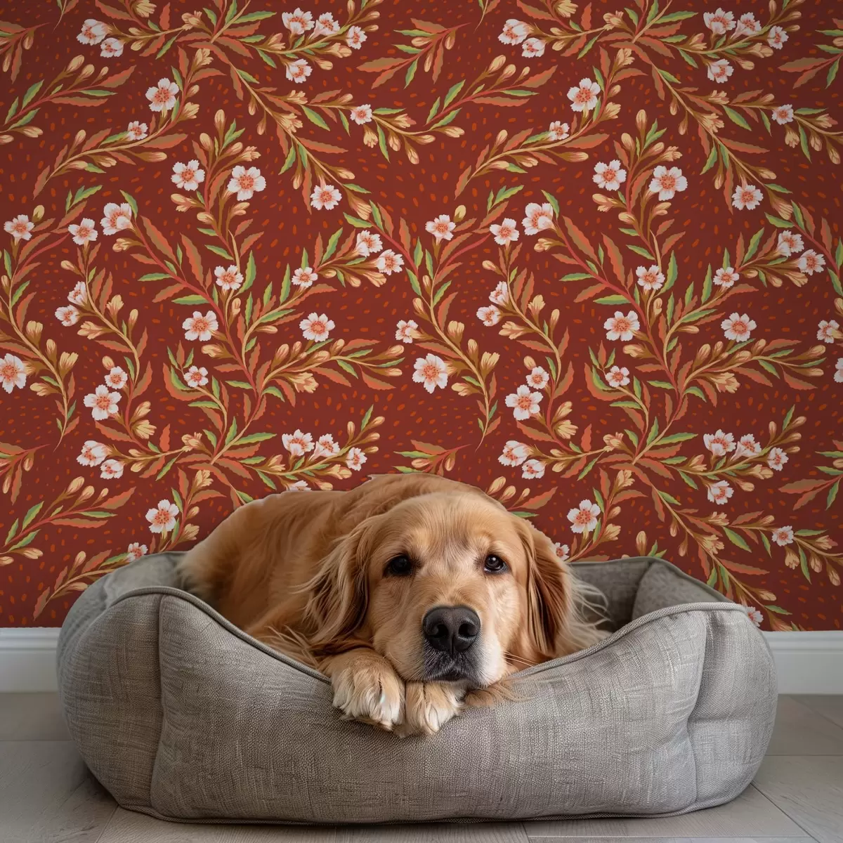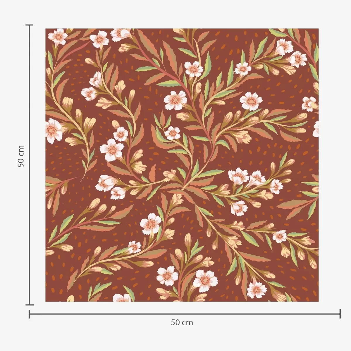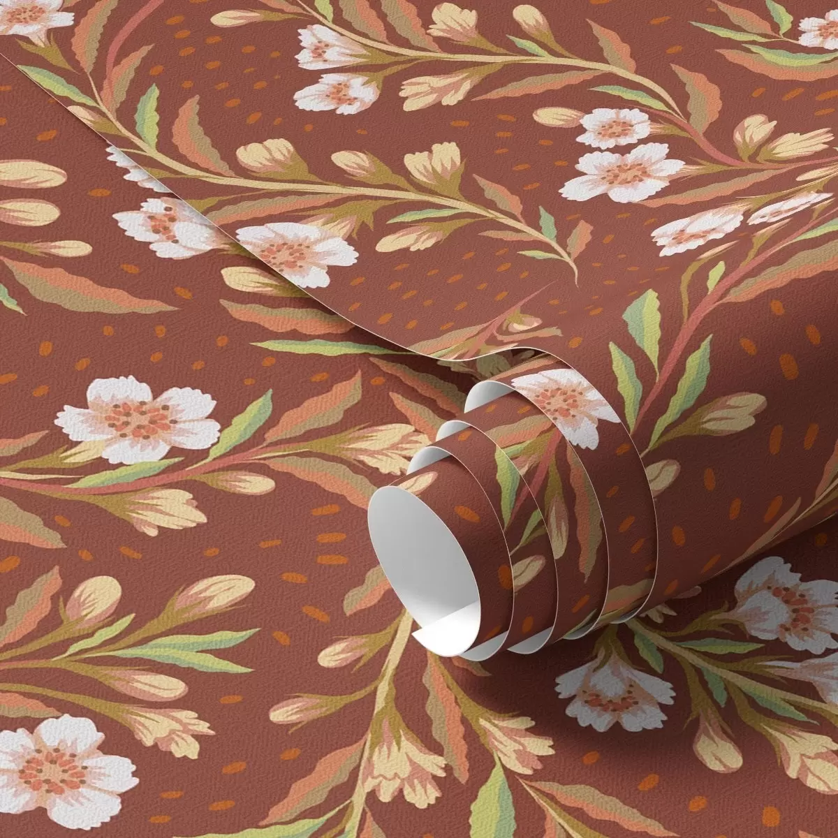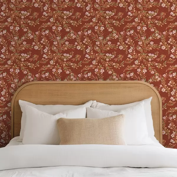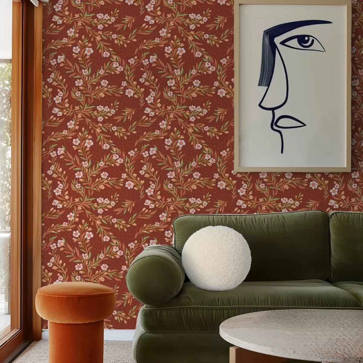 Tapete Weitläufige Zweige mit weißen Blüten auf terrakottafarbenem Hintergrund Nr. a00850v1