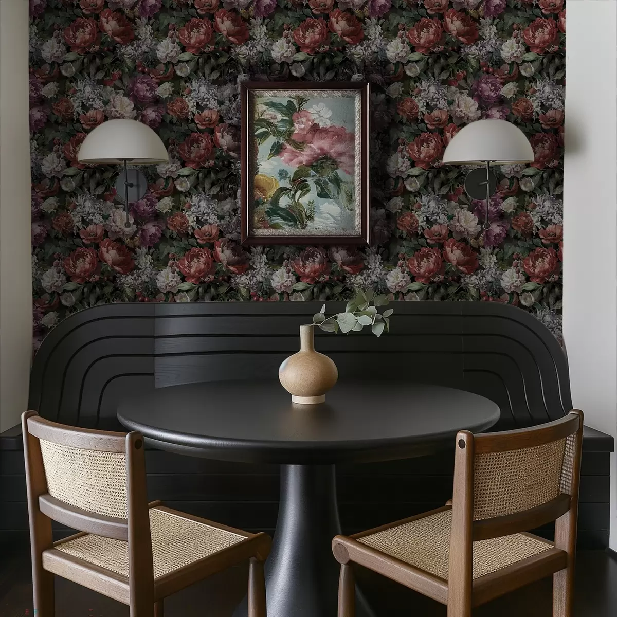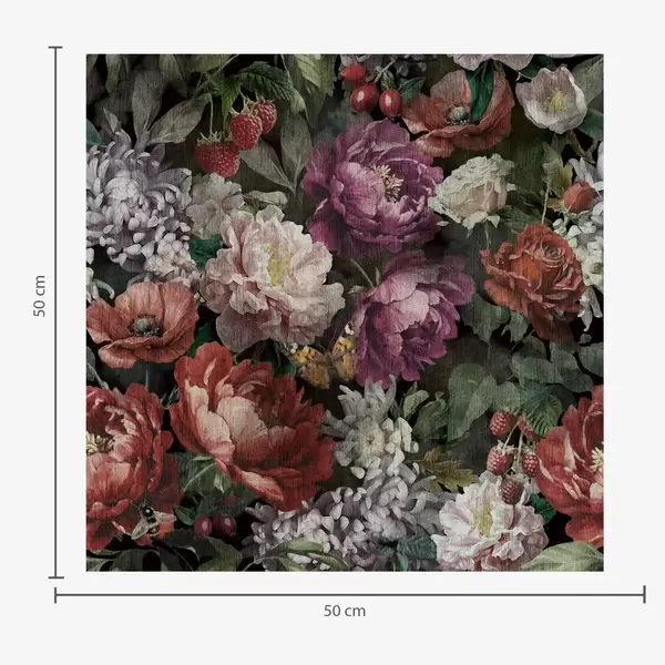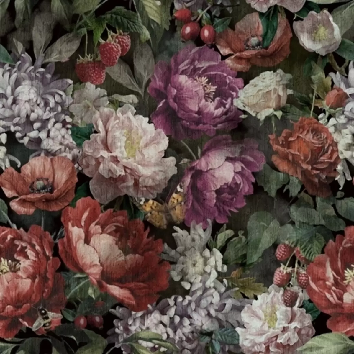 Fototapeten Dunkle, dramatische Pfingstrosen, Beeren und Schmetterling auf schwarzem Hintergrund N° a00862