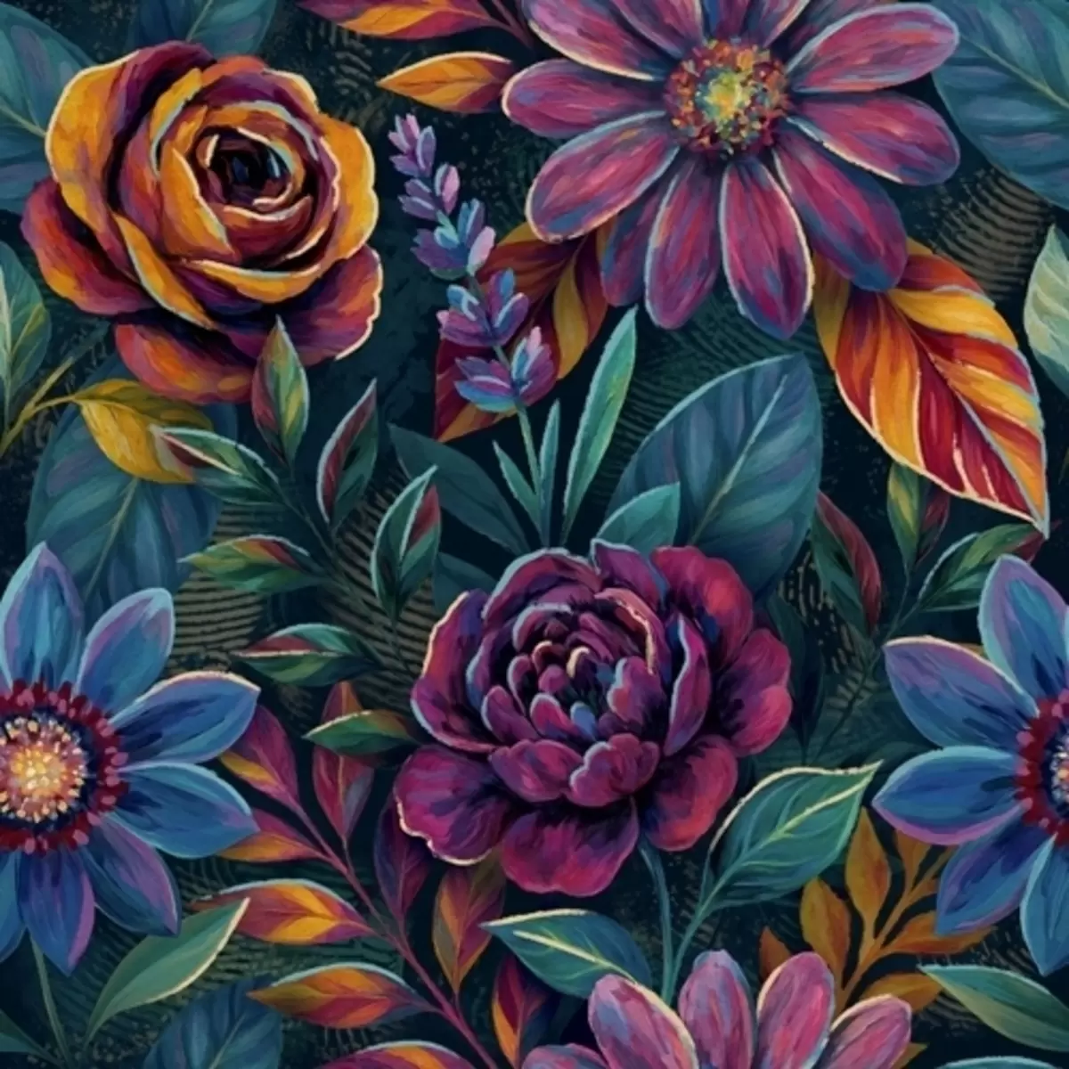 Fototapeten Lebhafte Blumen in Juwelenfarben auf tiefem Marineblau N° a00871