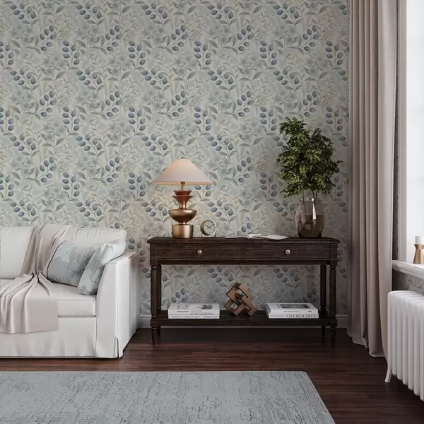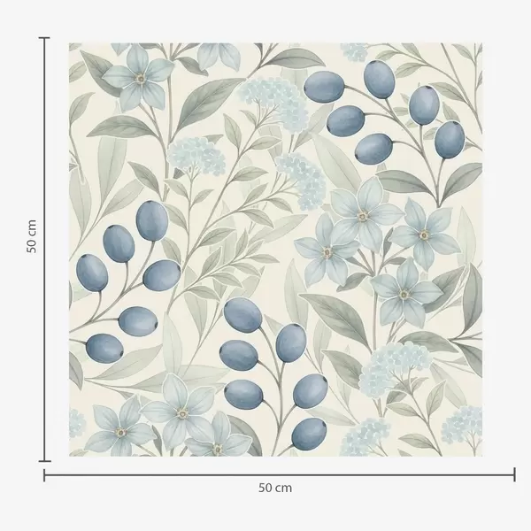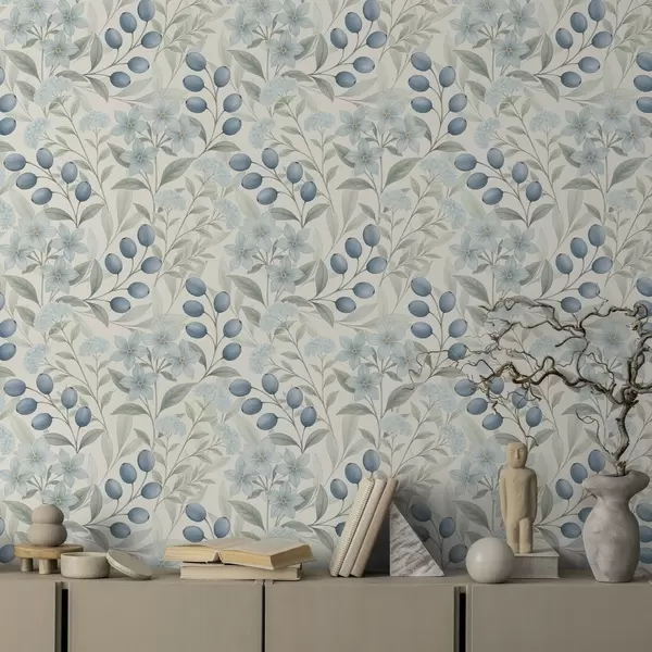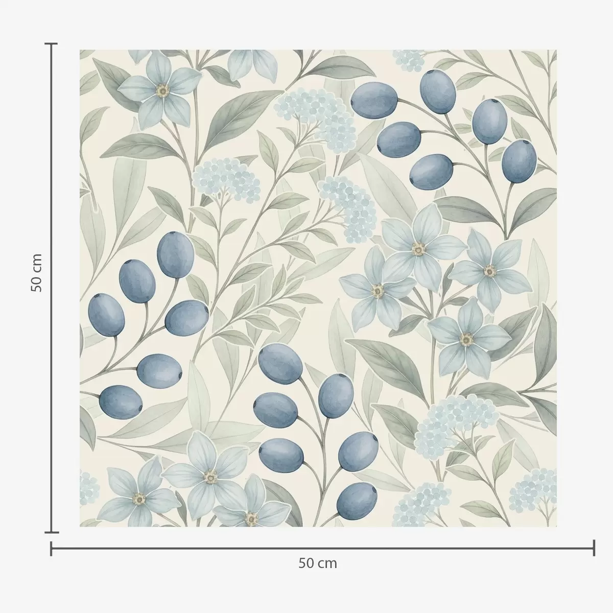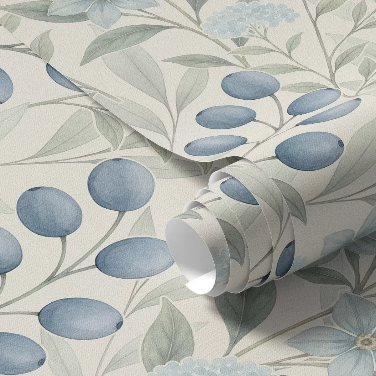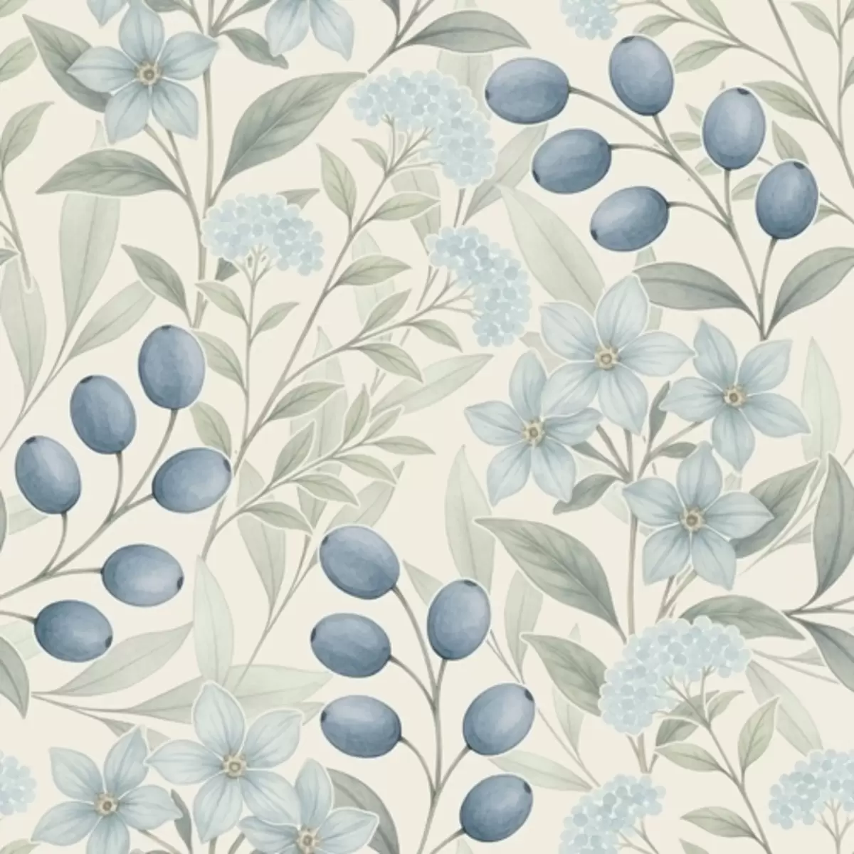 Fototapeten Blaue Beeren und helle Blüten auf Elfenbein N° a00872