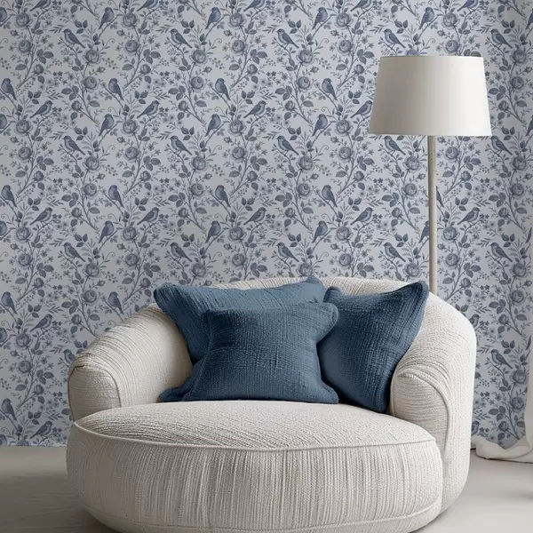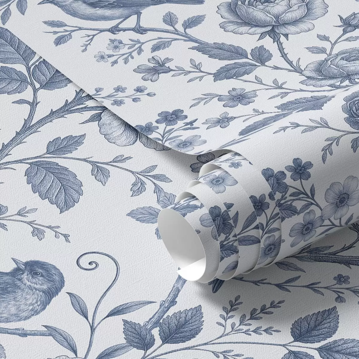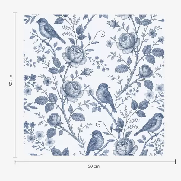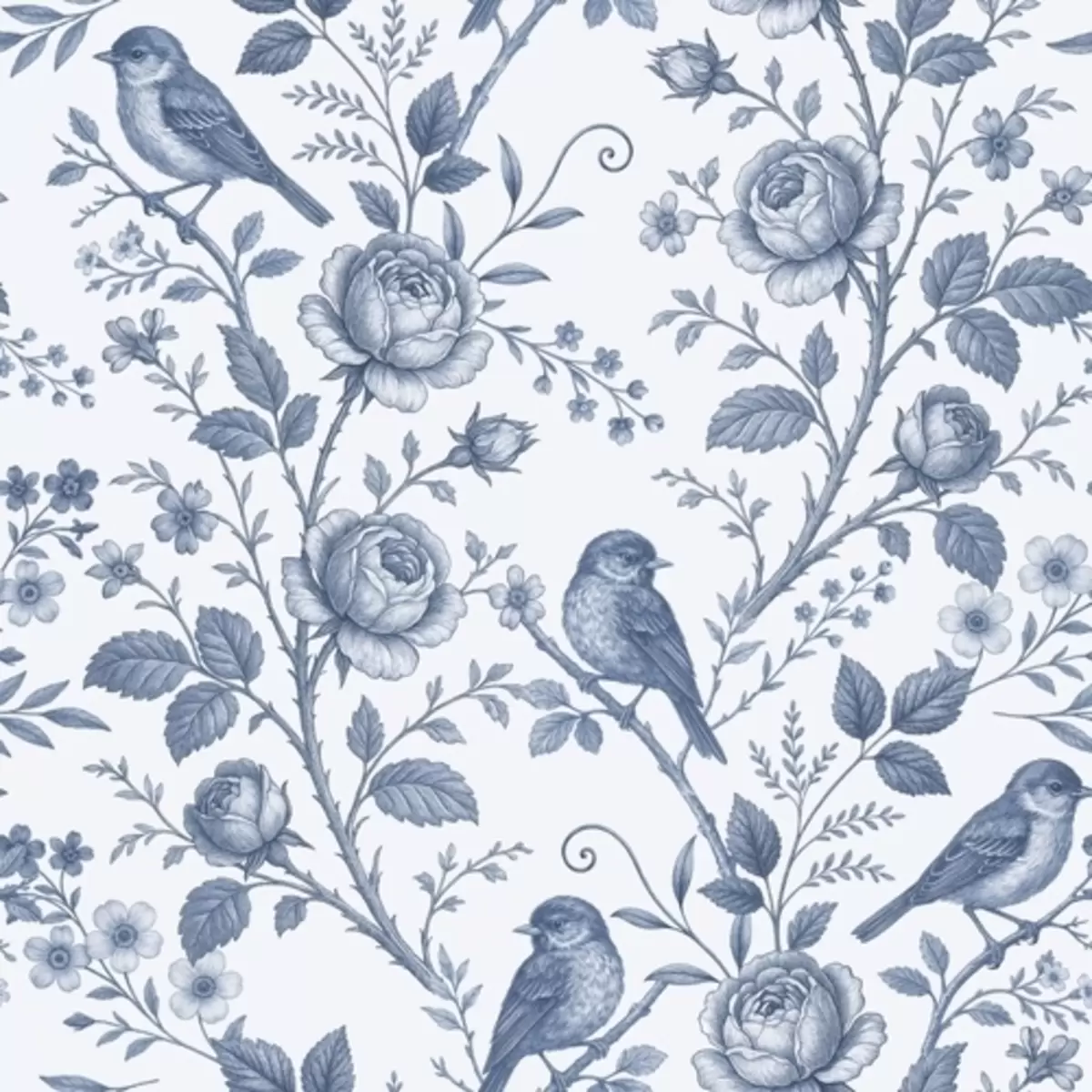 Fototapeten Blaue Toile-Vögel und Rosen auf weißem Hintergrund N° a00873