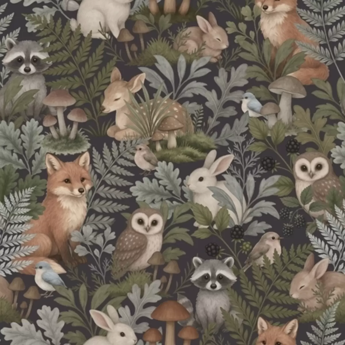 Fototapeten Waldtiere und Farne auf tiefem Anthrazit N° a00880