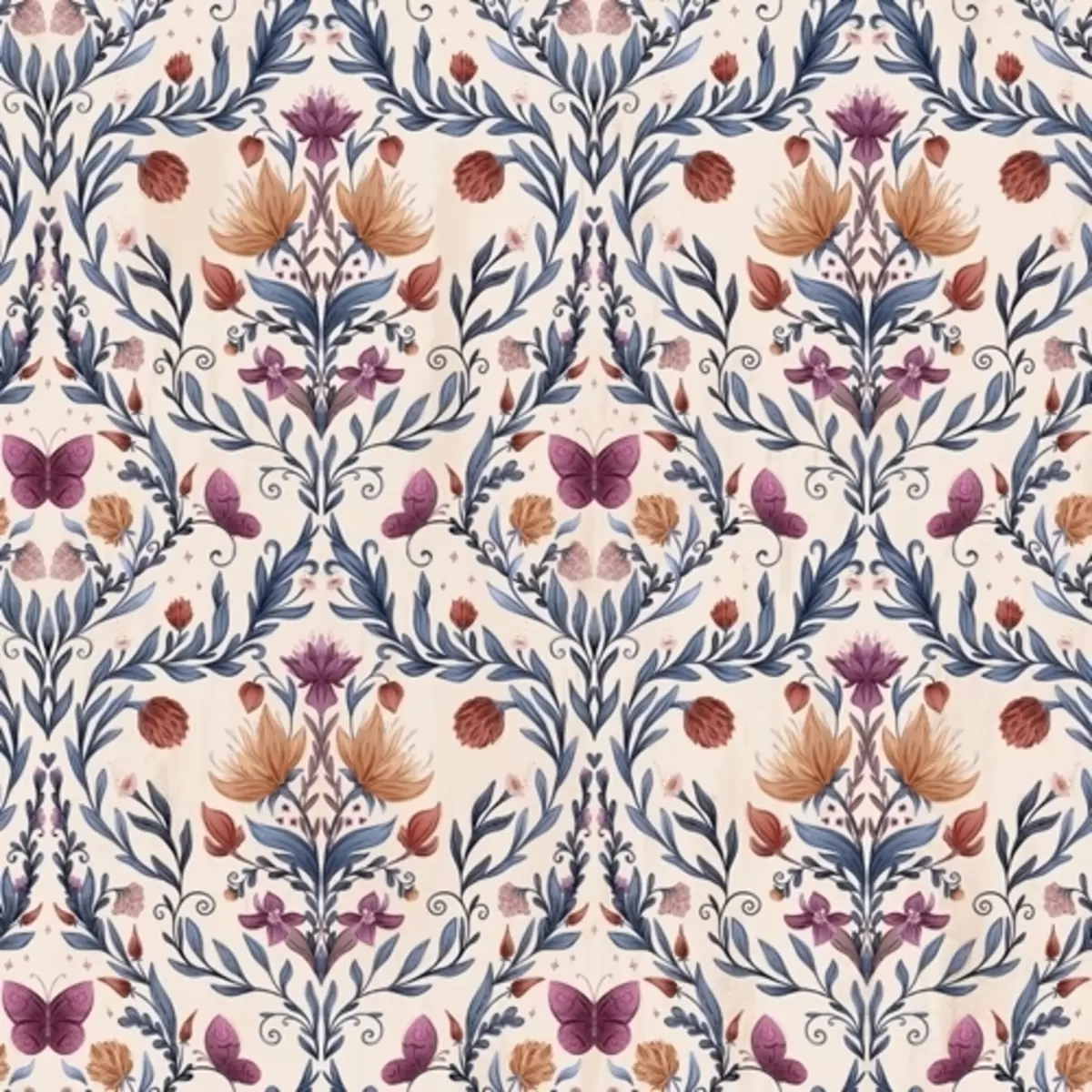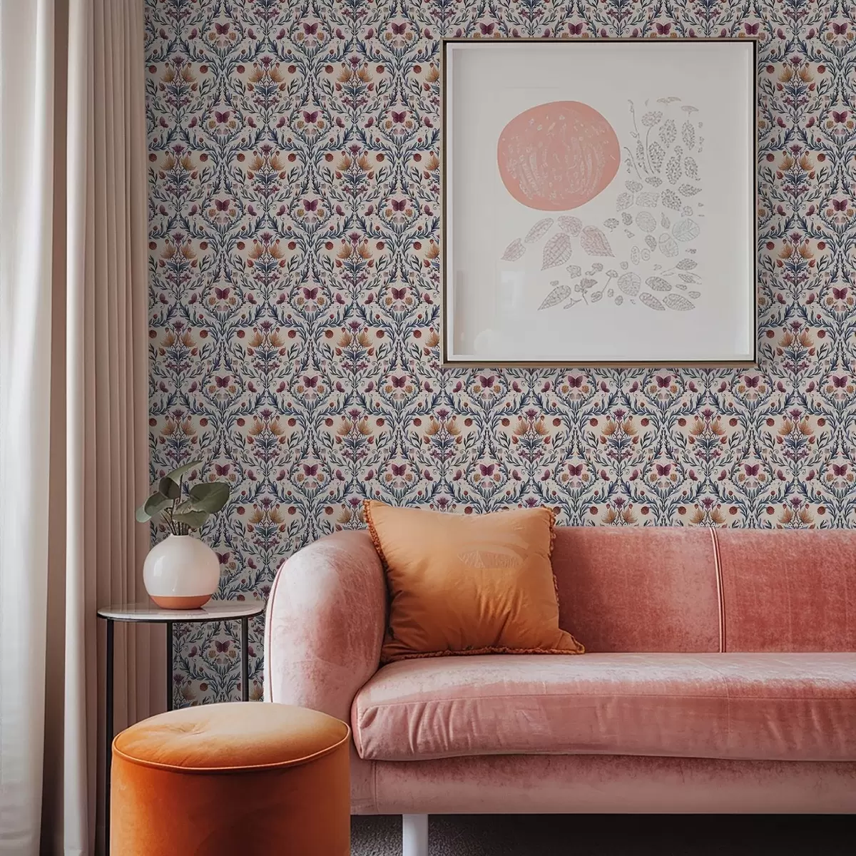 Fototapeten Blumen-Damast mit Schmetterlingen auf zartem Pfirsichhintergrund N° a00926