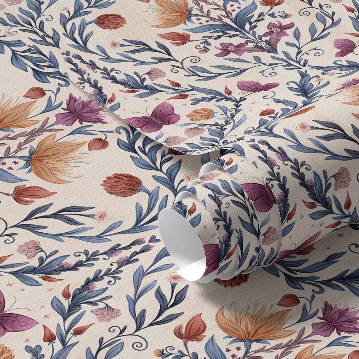 Fototapeten Blumen-Damast mit Schmetterlingen auf zartem Pfirsichhintergrund N° a00926