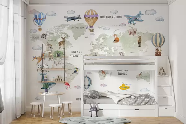 Fototapeten Kinderkarte im Aquarellstil mit Tieren und Heißluftballons. Spanische Sprache. Grüne Farbe. N° c00001es