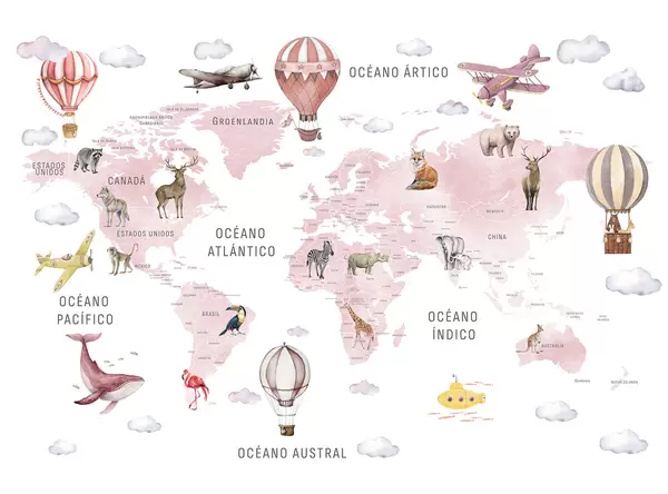 Fototapeten Kinderkarte im Aquarellstil mit Tieren und Heißluftballons. Spanische Sprache. Beige Farbe. N° c00001esv2