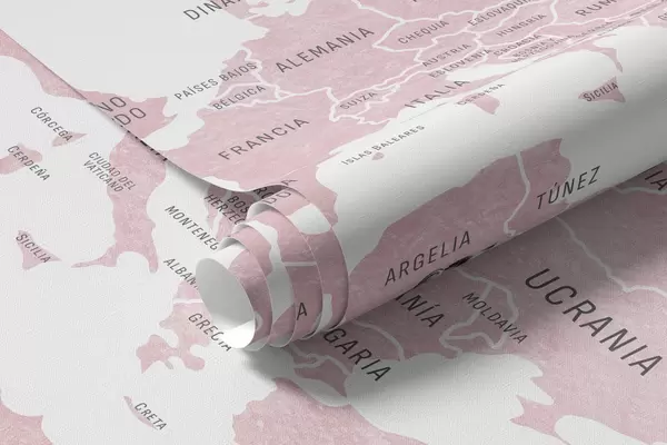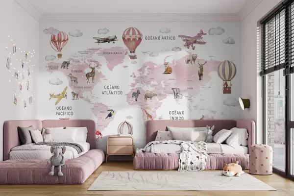Fototapeten Kinderkarte im Aquarellstil mit Tieren und Heißluftballons. Spanische Sprache. Rosa Farbe. N° c00001esv3
