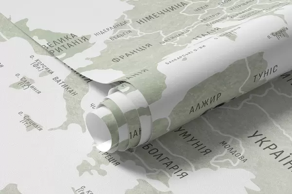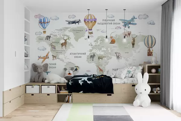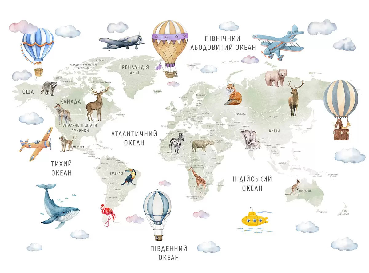 Fototapeten Kinderkarte im Aquarellstil mit Tieren und Heißluftballons. Ukrainische Sprache. Grüne Farbe. N° c00001uk