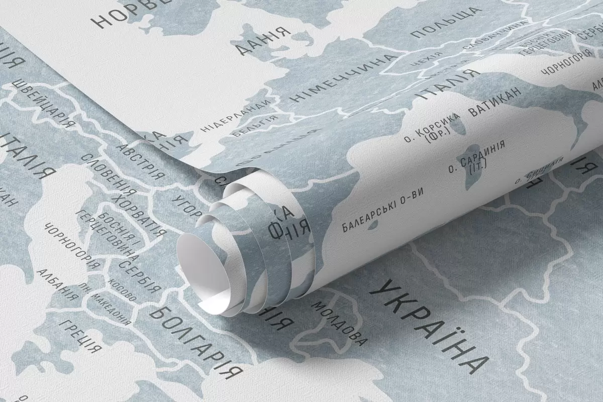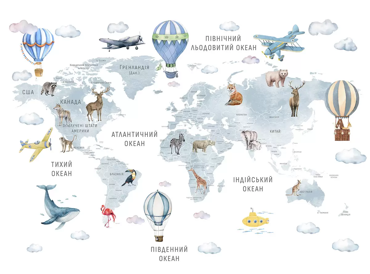 Fototapeten Kinderkarte im Aquarellstil mit Tieren und Heißluftballons. Ukrainische Sprache. Blaue Farbe. N° c00001ukv1