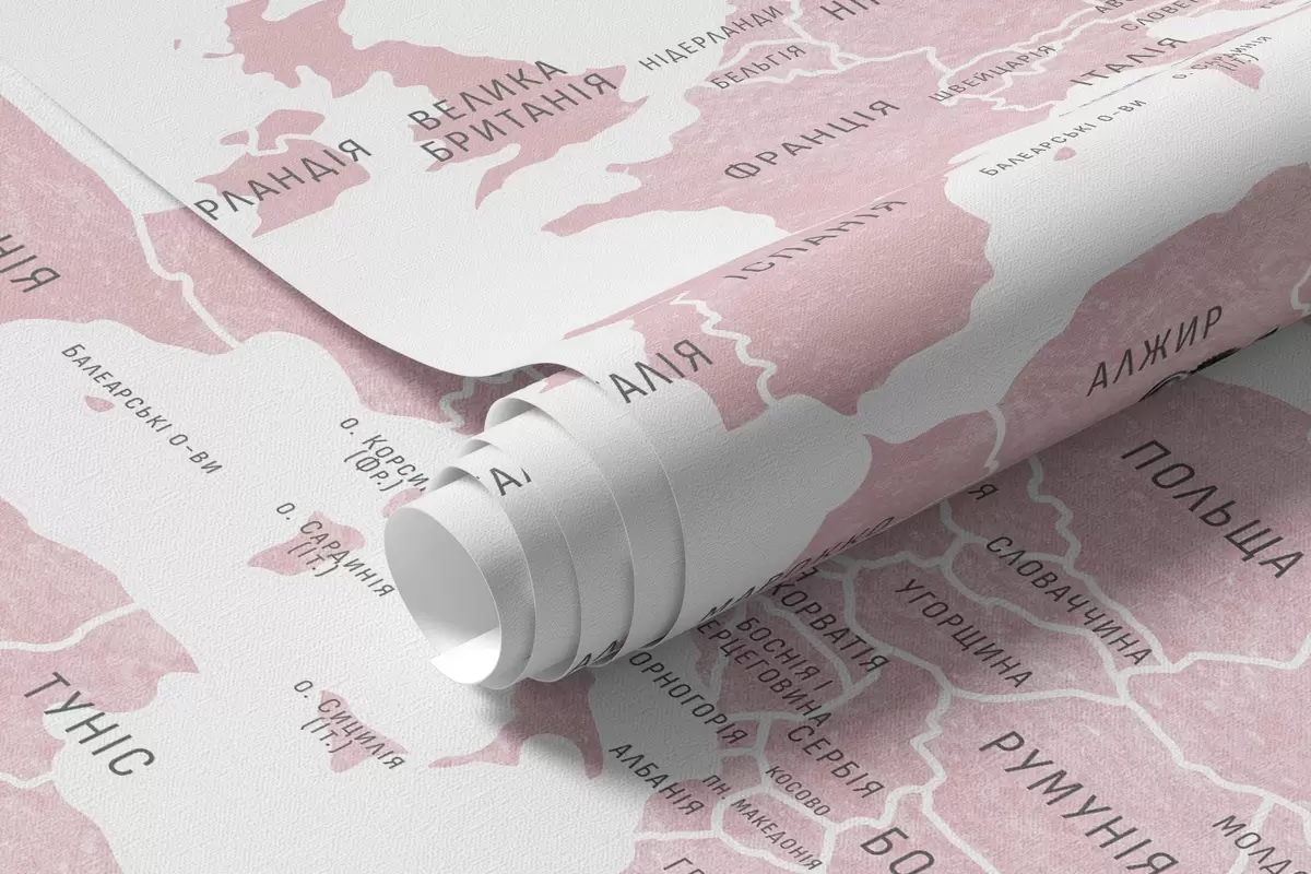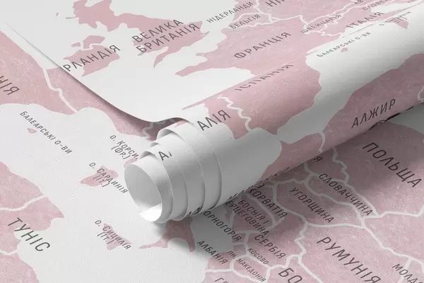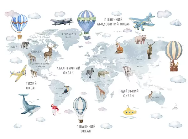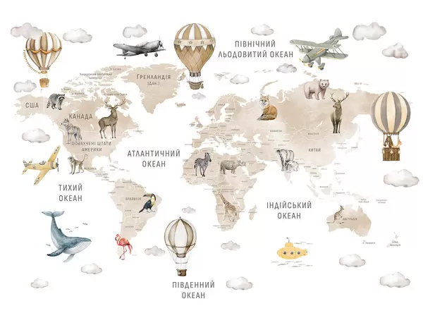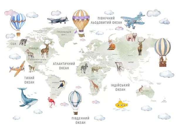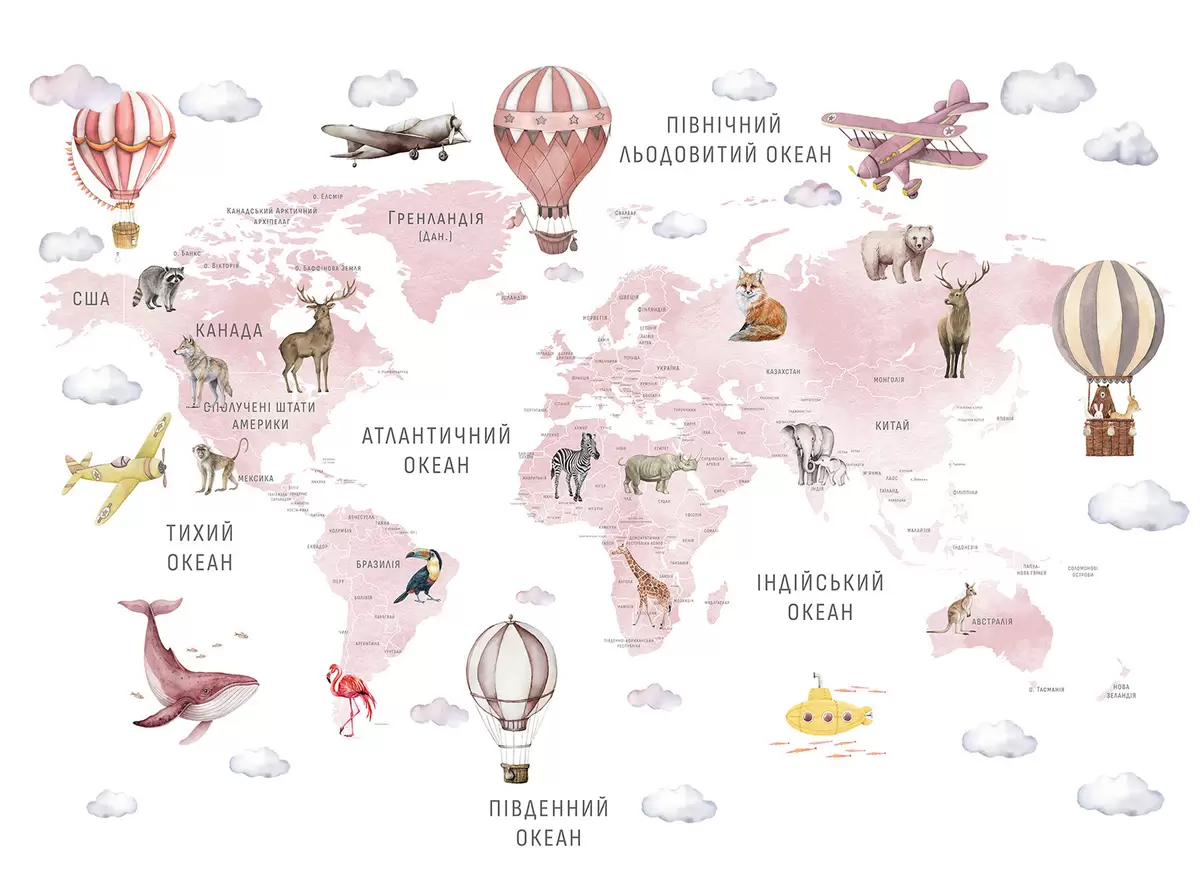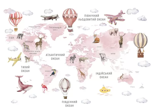Fototapeten Kinderkarte im Aquarellstil mit Tieren und Heißluftballons. Ukrainische Sprache. Rosa Farbe. N° c00001ukv3
