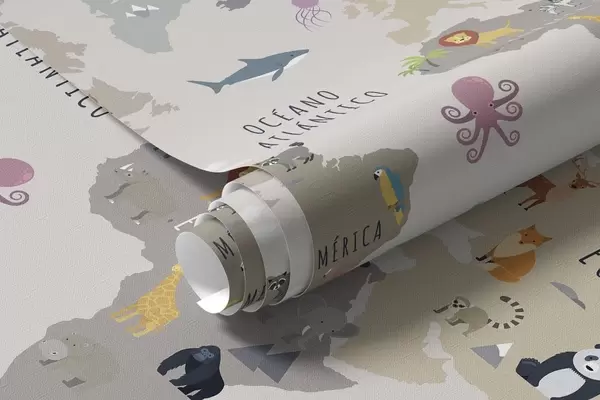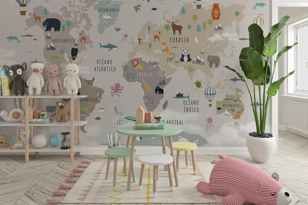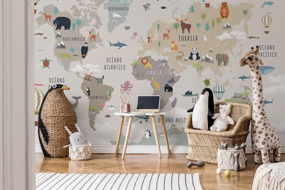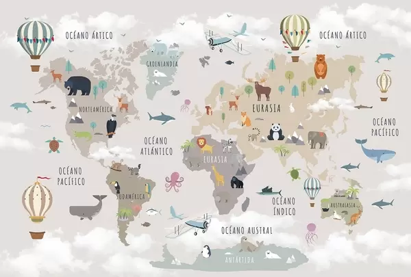 Fototapeten Kinderweltkarte mit Tieren und Heißluftballons. Spanische Sprache N° c00002es