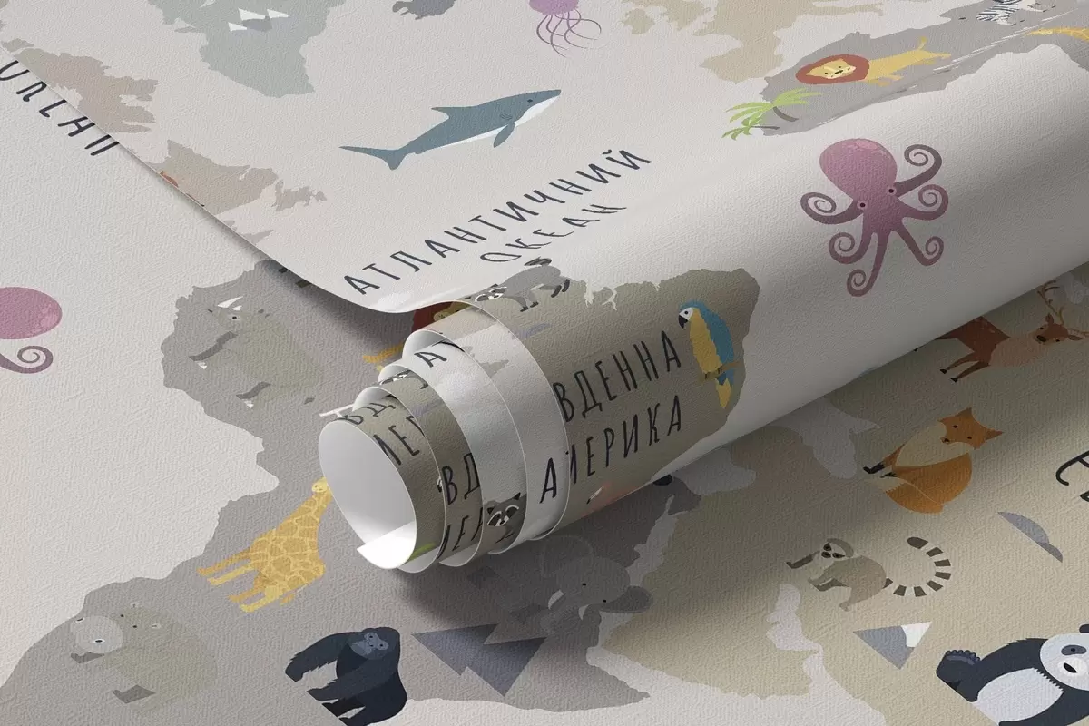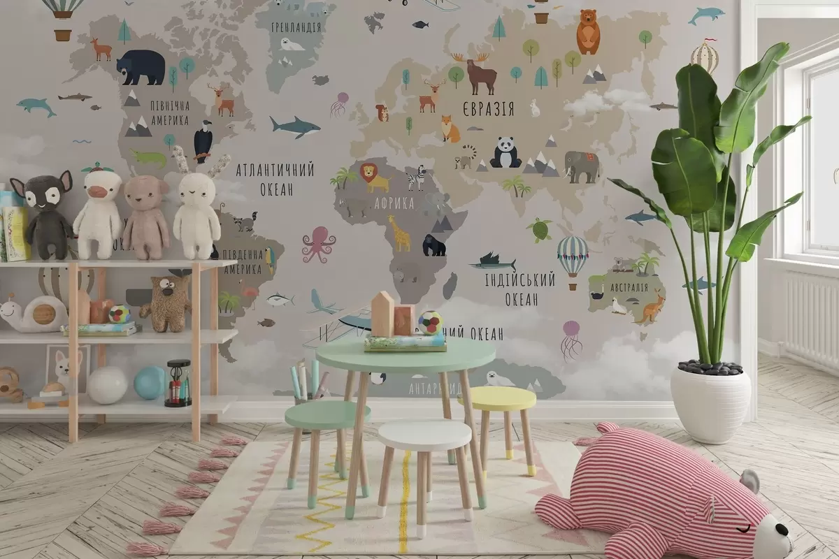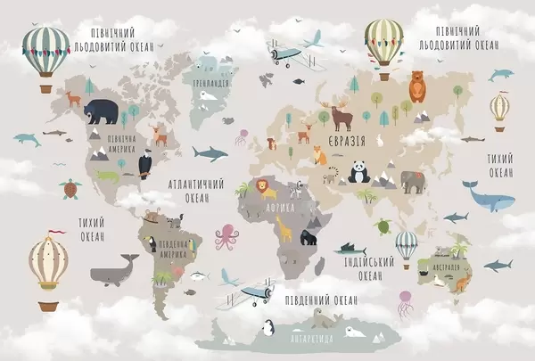 Fototapeten Kinderweltkarte mit Tieren und Heißluftballons. Ukrainische Sprache N° c00002uk