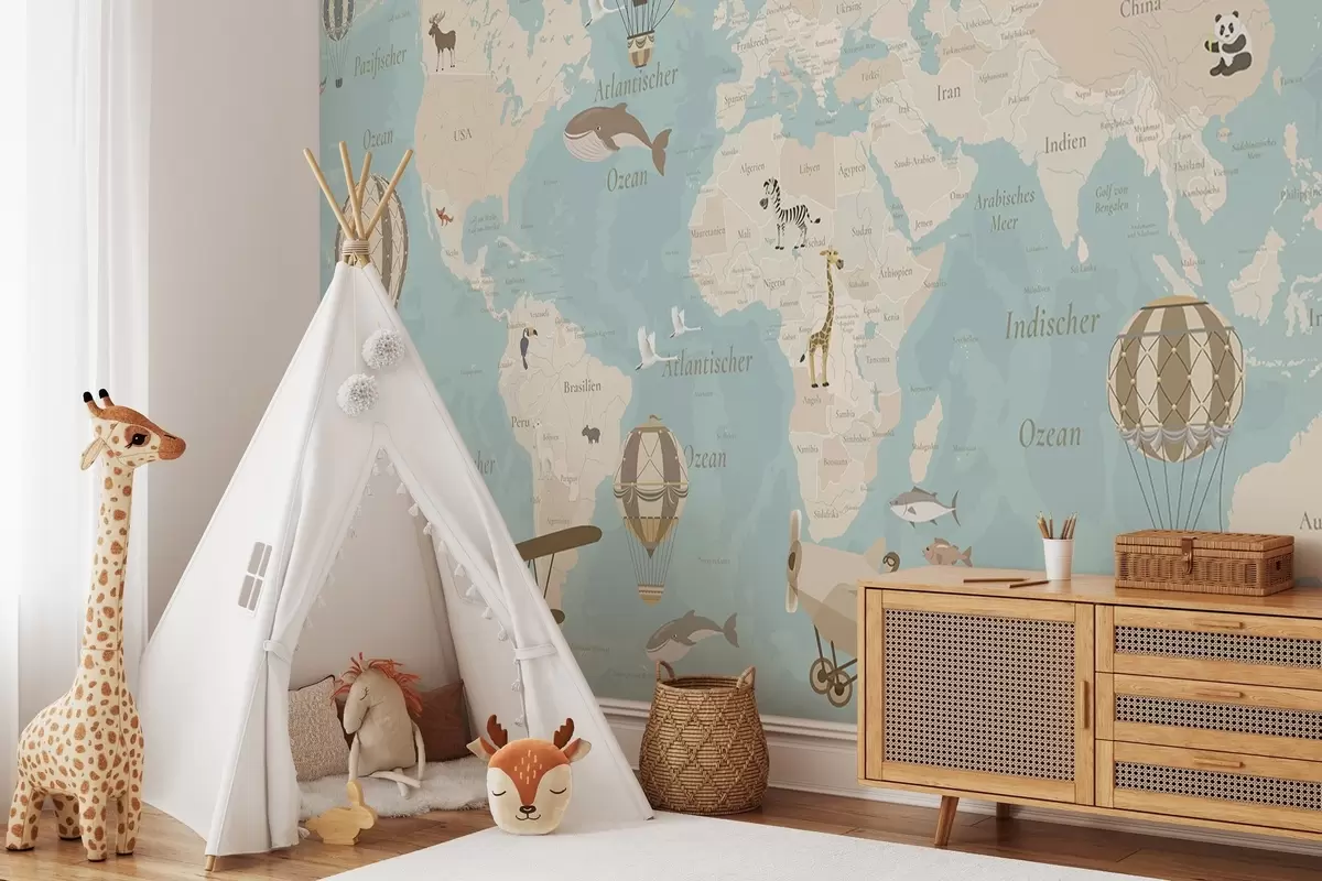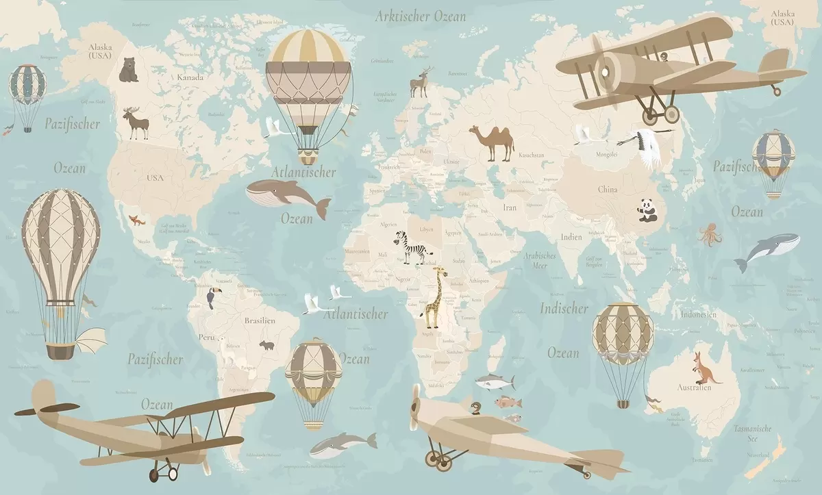 Fototapeten Kinderweltkarte mit Tieren, Flugzeugen und Heißluftballons. Deutsche Sprache. Farbe: Blau N° c00003dev1