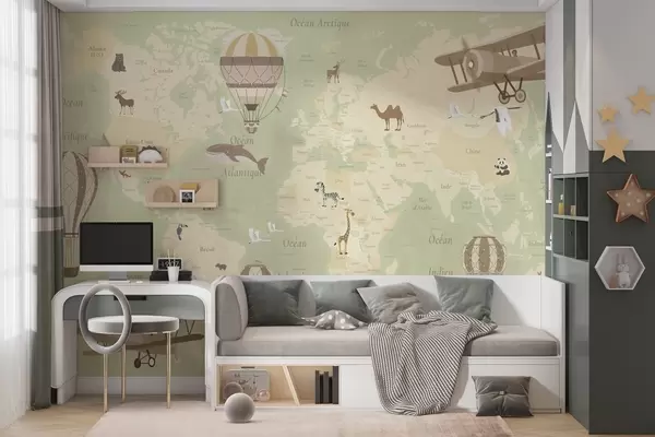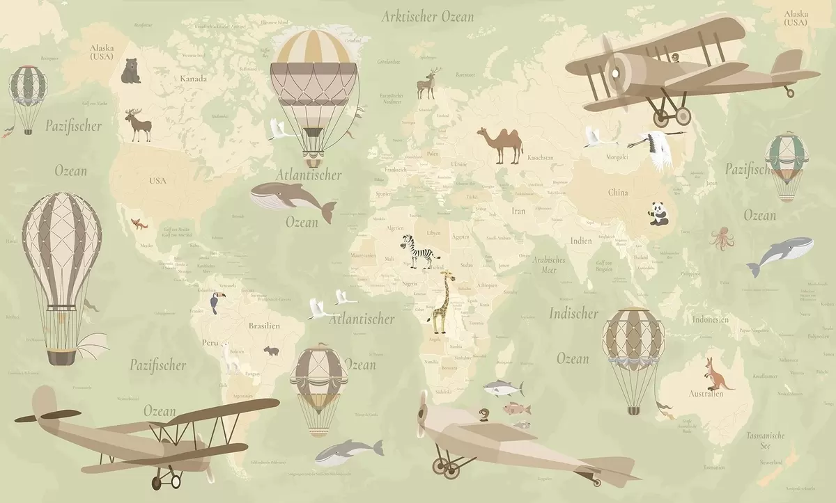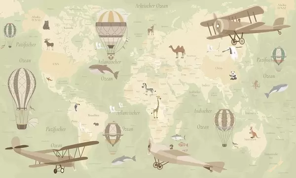 Fototapeten Kinderweltkarte mit Tieren, Flugzeugen und Heißluftballons. Deutsche Sprache. Grüne Farbe. N° c00003dev2
