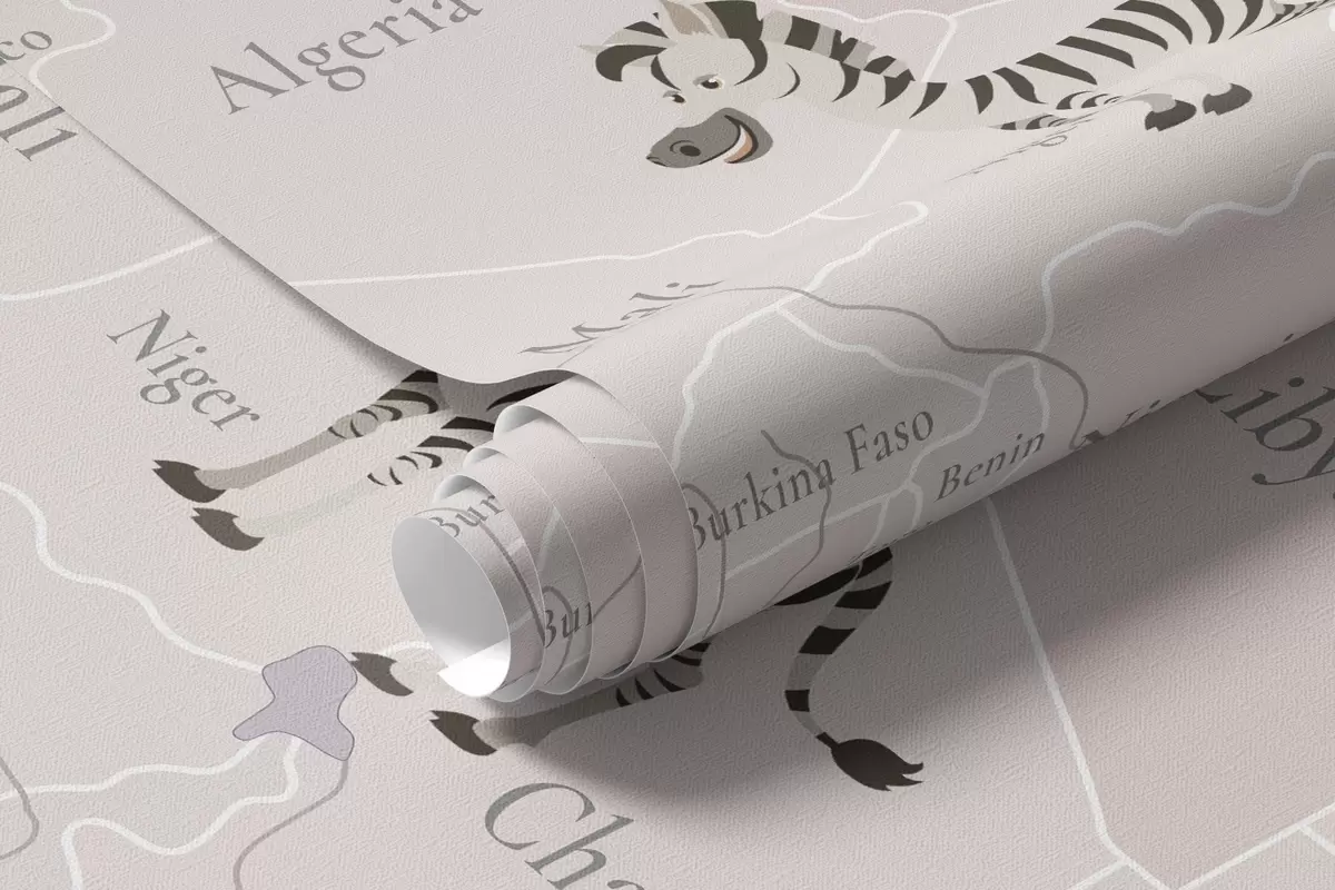 Fototapeten Kinderweltkarte mit Tieren, Flugzeugen und Heißluftballons. Englische Sprache. Farbe: Lila N° c00003env4