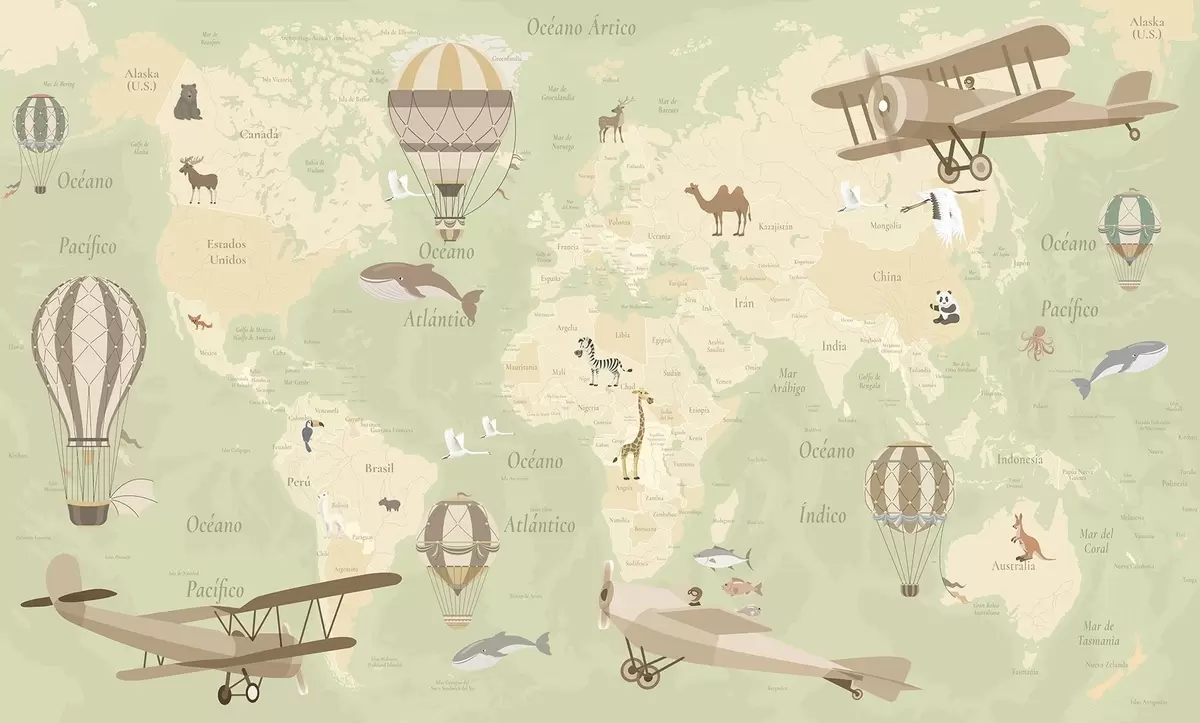 Fototapeten Kinderweltkarte mit Tieren, Flugzeugen und Heißluftballons. Spanische Sprache. Grüne Farbe. N° c00003esv2