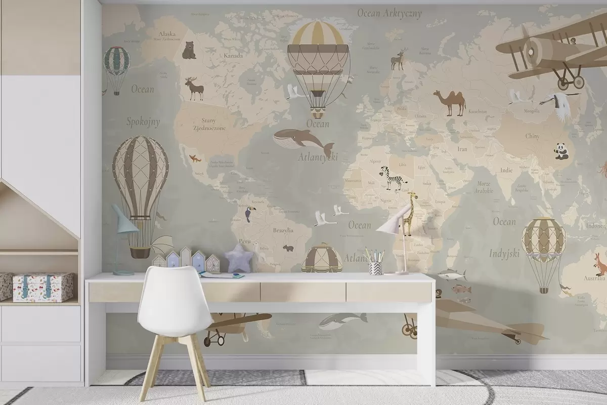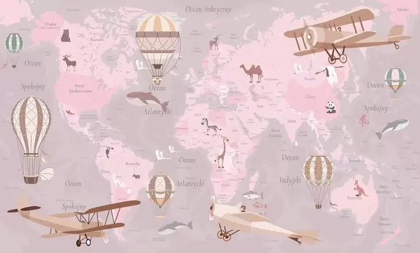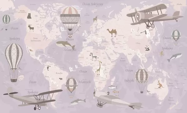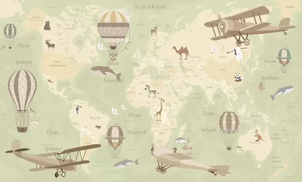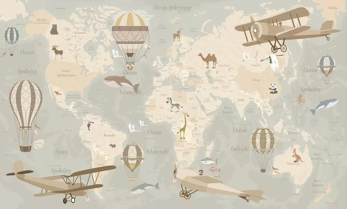 Fototapeten Kinderweltkarte mit Tieren, Flugzeugen und Heißluftballons. Polnische Sprache. Beige Farbe N° c00003pl