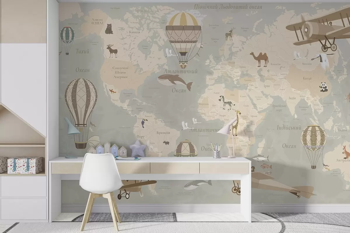 Fototapeten Kinderweltkarte mit Tieren, Flugzeugen und Heißluftballons. Ukrainische Sprache. Beige Farbe N° c00003uk