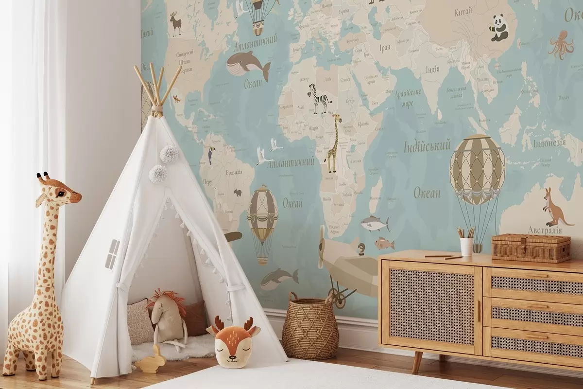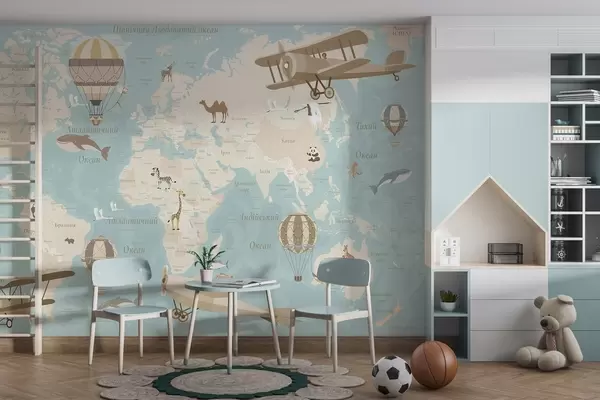 Fototapeten Kinderweltkarte mit Tieren, Flugzeugen und Heißluftballons. Ukrainische Sprache. Blaue Farbe N° c00003ukv1