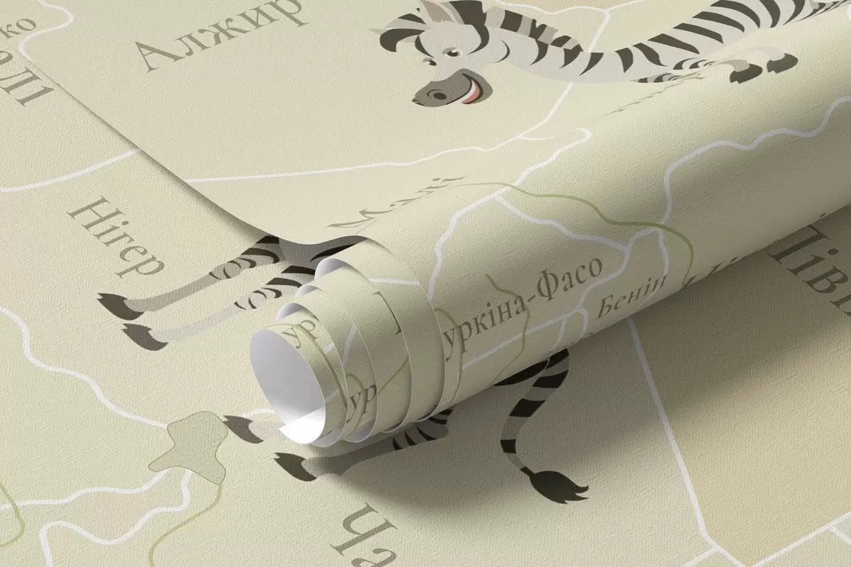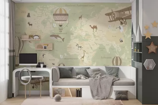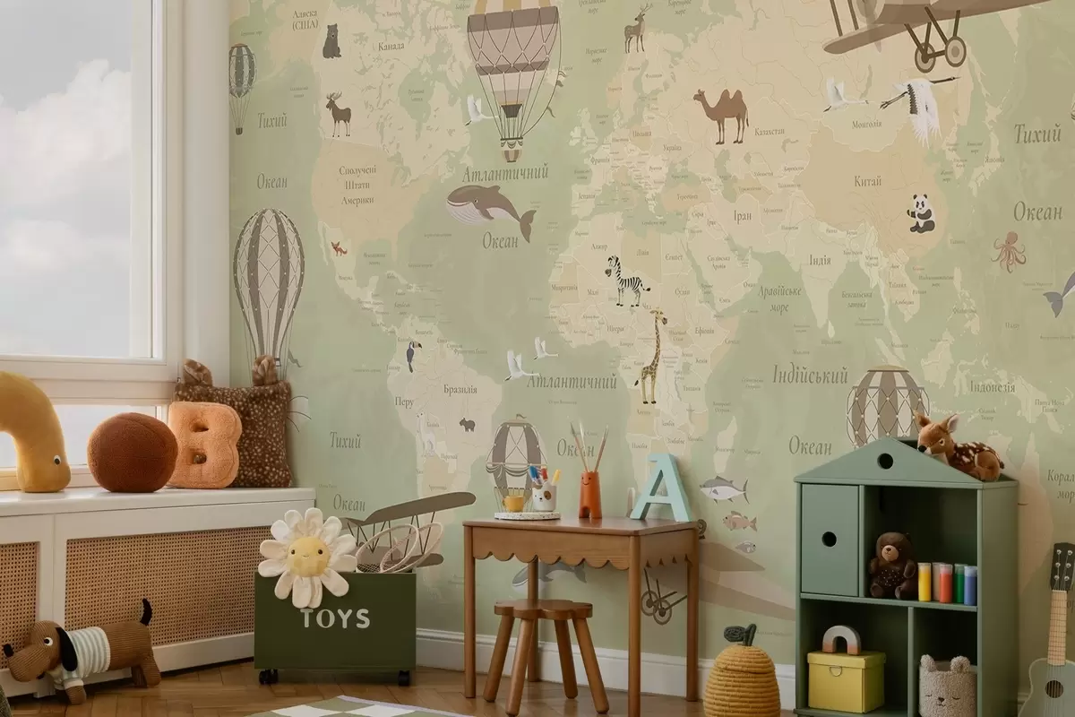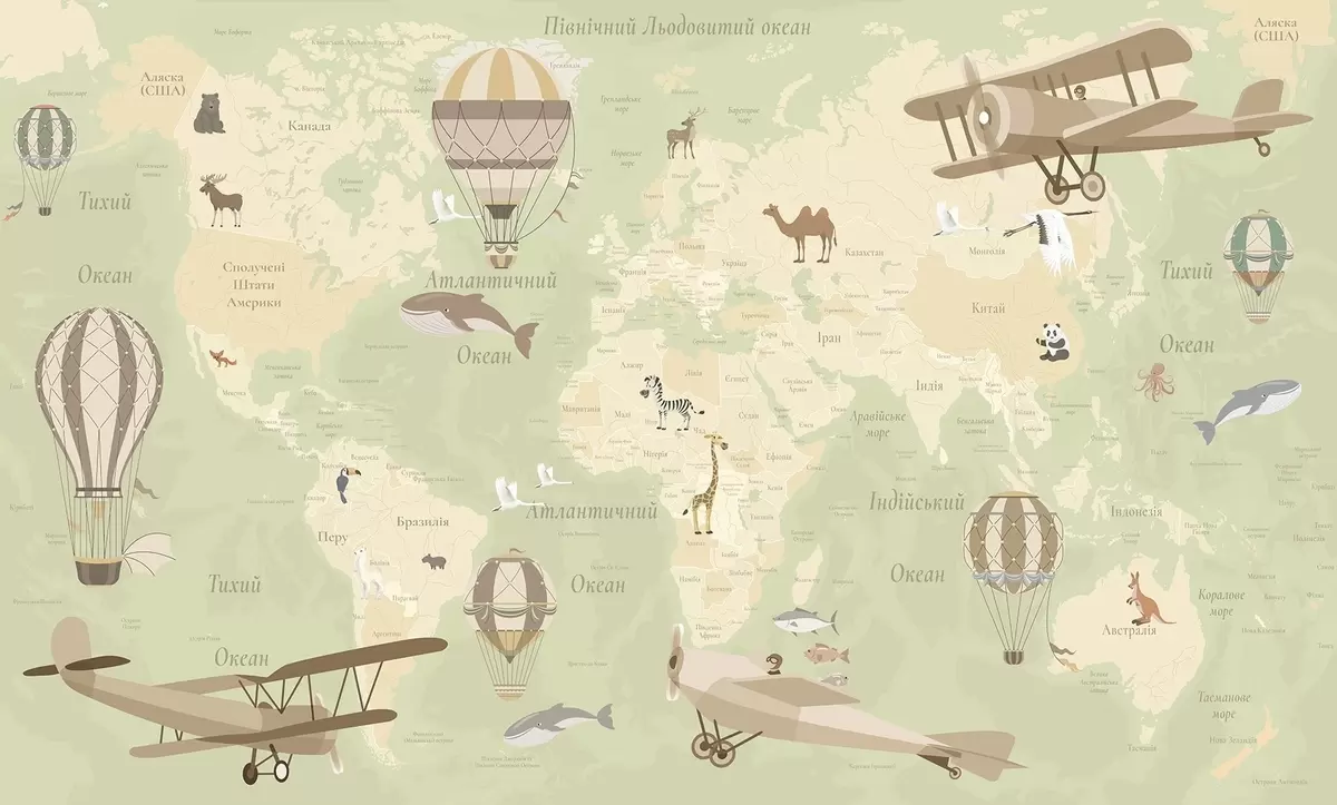 Fototapeten Kinderweltkarte mit Tieren, Flugzeugen und Heißluftballons. Ukrainische Sprache. Grüne Farbe N° c00003ukv2