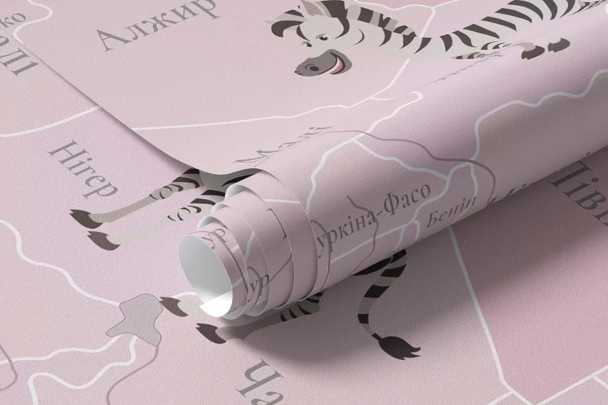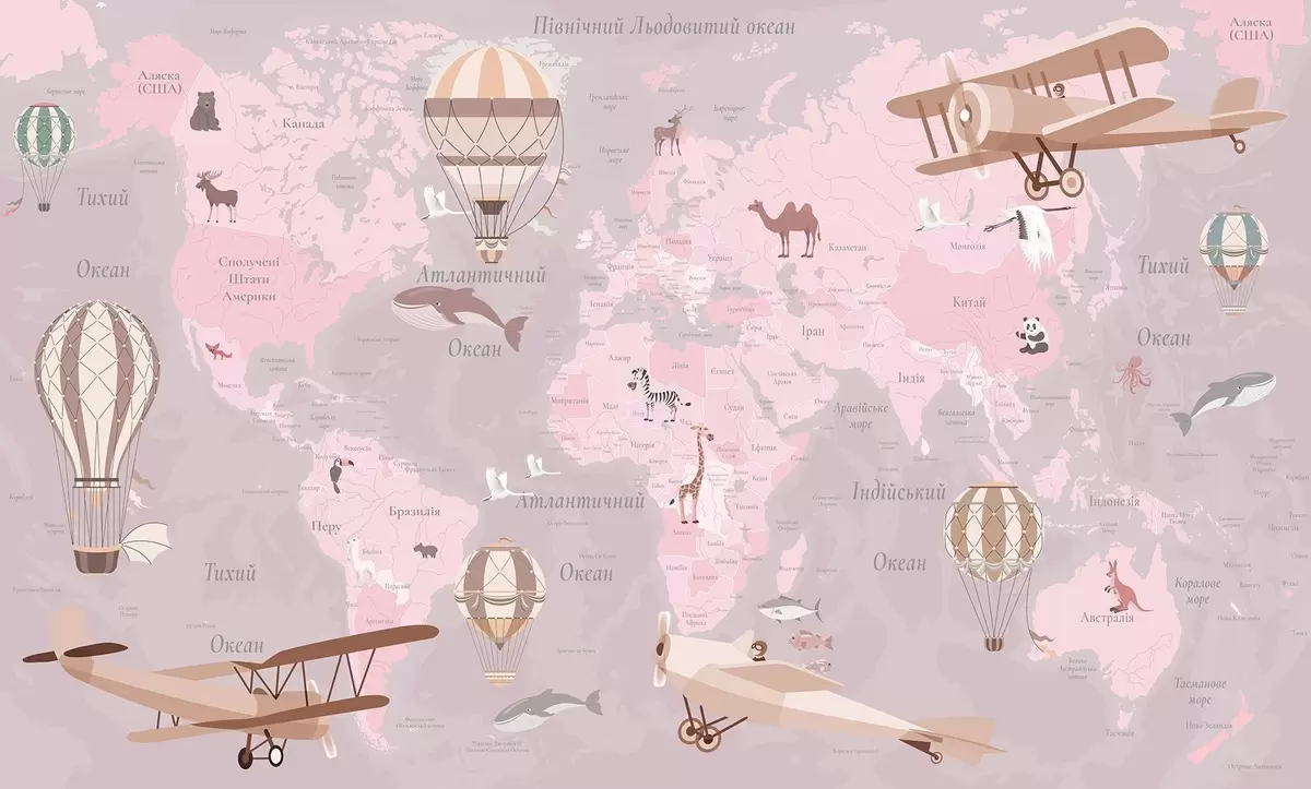Fototapeten Kinderweltkarte mit Tieren, Flugzeugen und Heißluftballons. Ukrainische Sprache. Rosa Farbe N° c00003ukv3