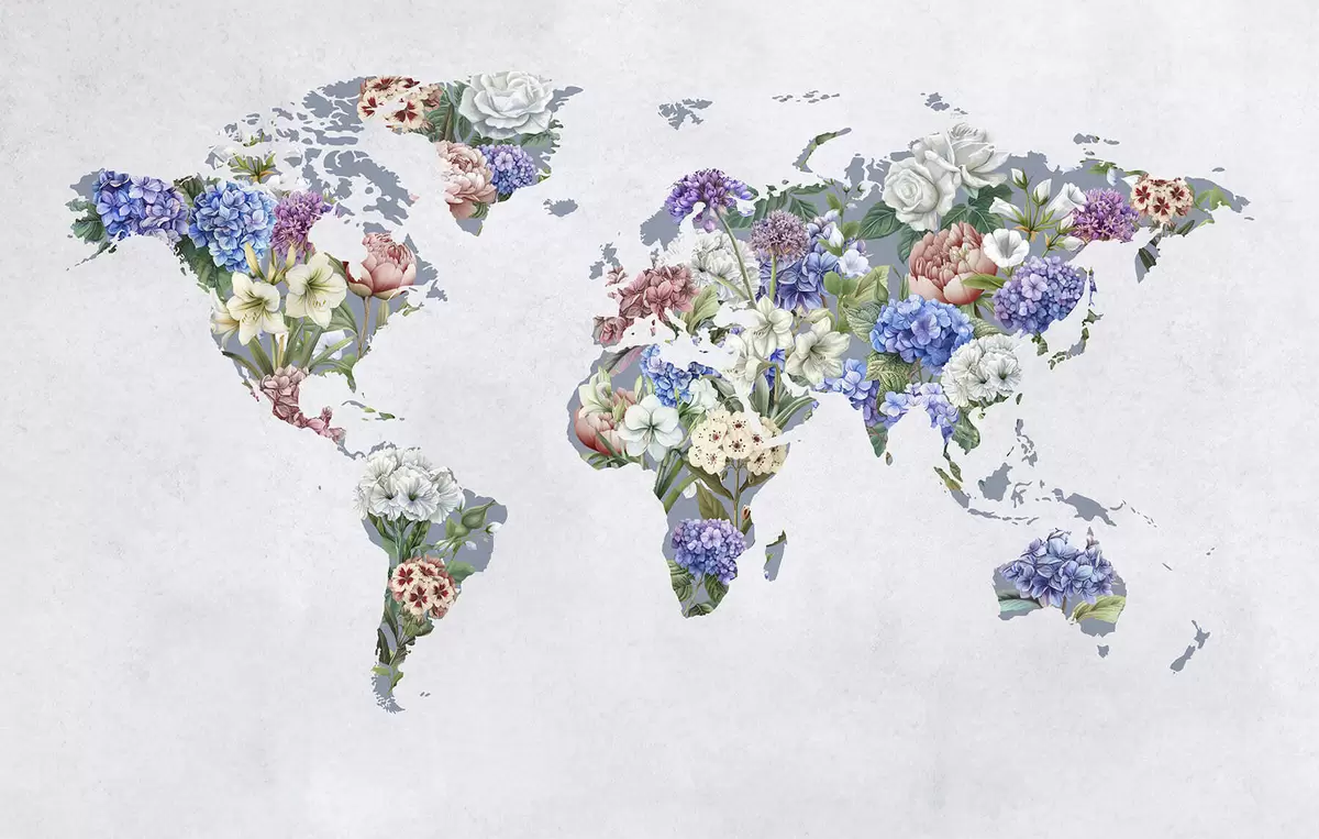 Fototapeten Eine farbenfrohe Weltkarte aus einer Vielzahl leuchtender Blumen N° c00006