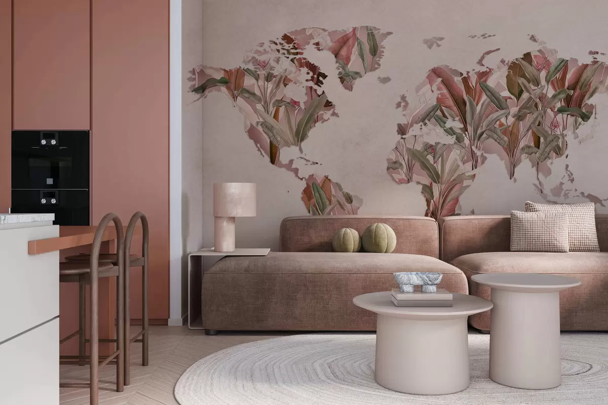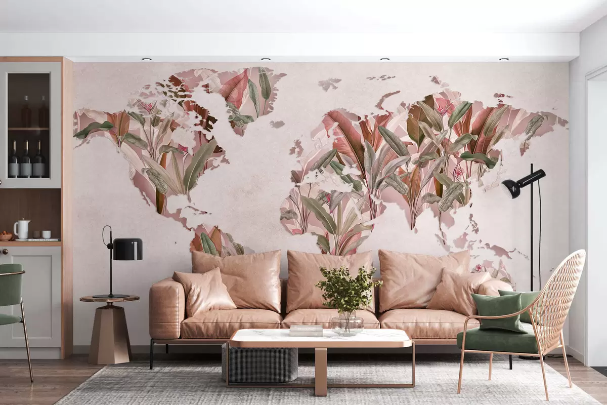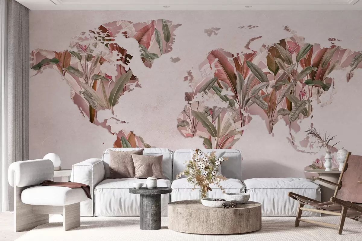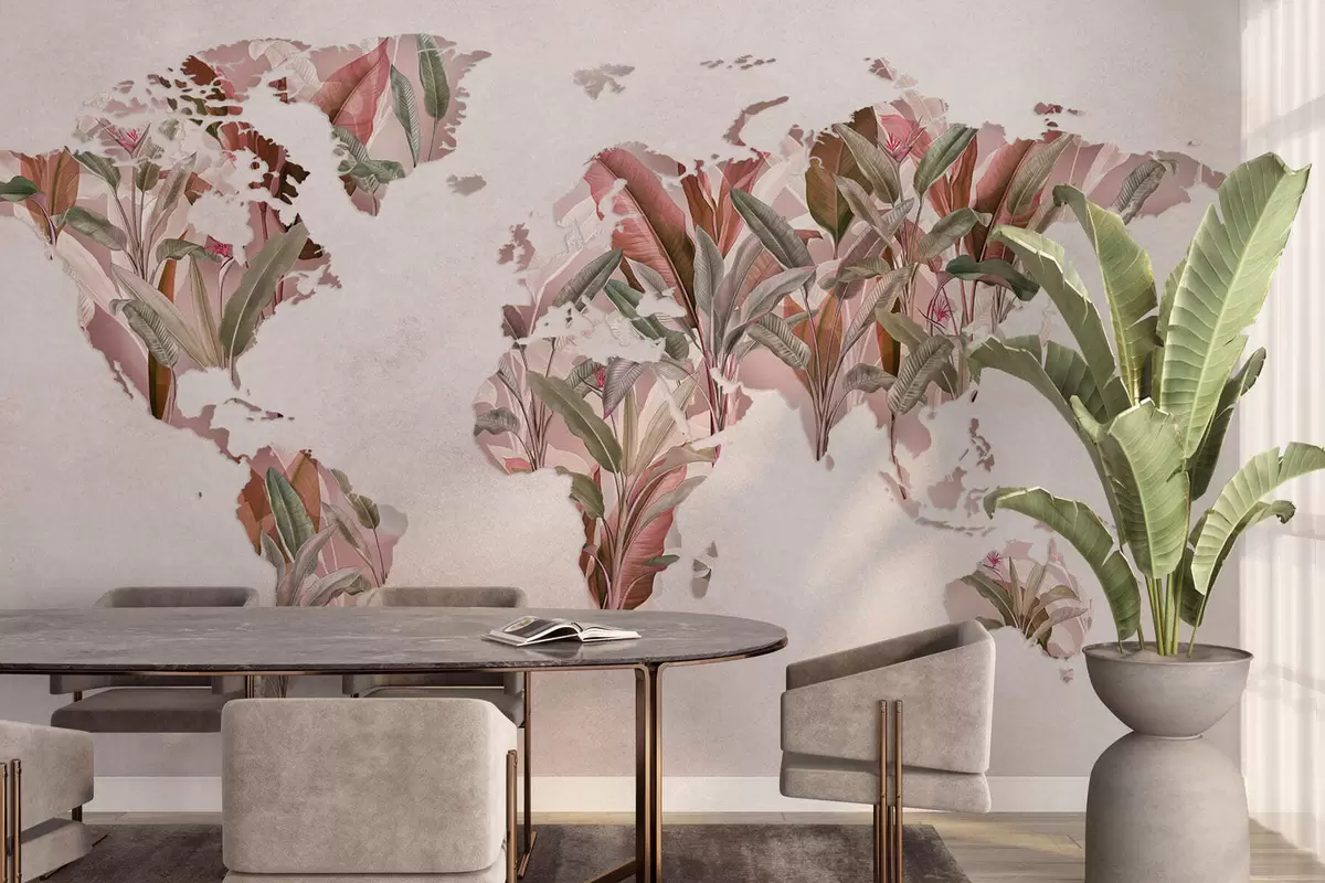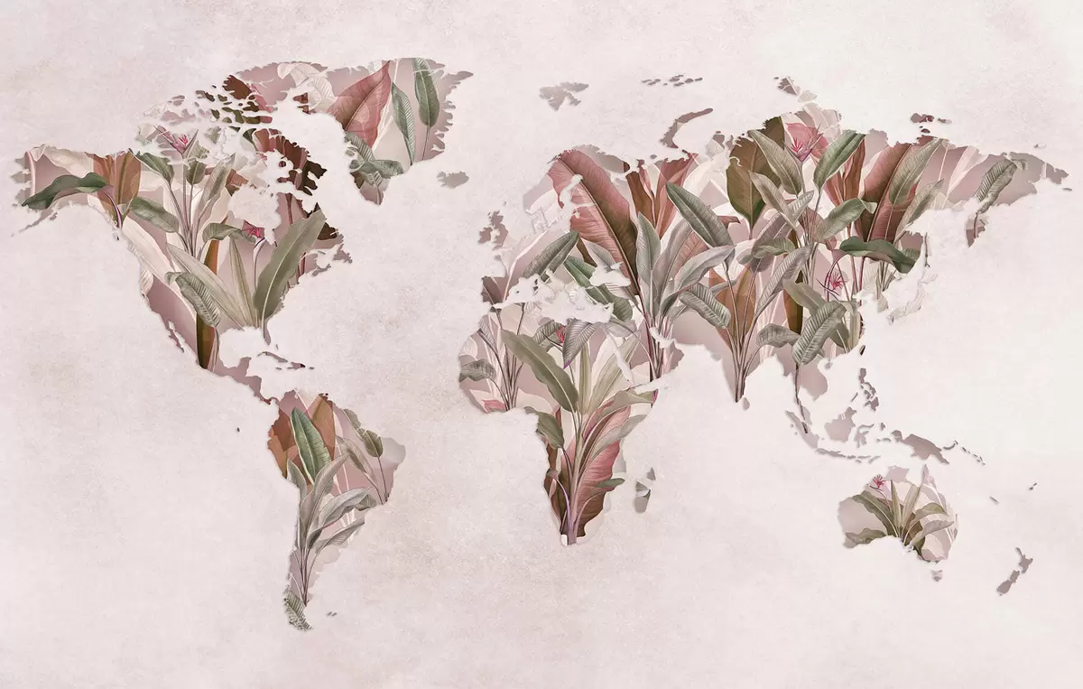 Fototapeten Eine rosa Weltkarte aus Bananenblättern N° c00007v2